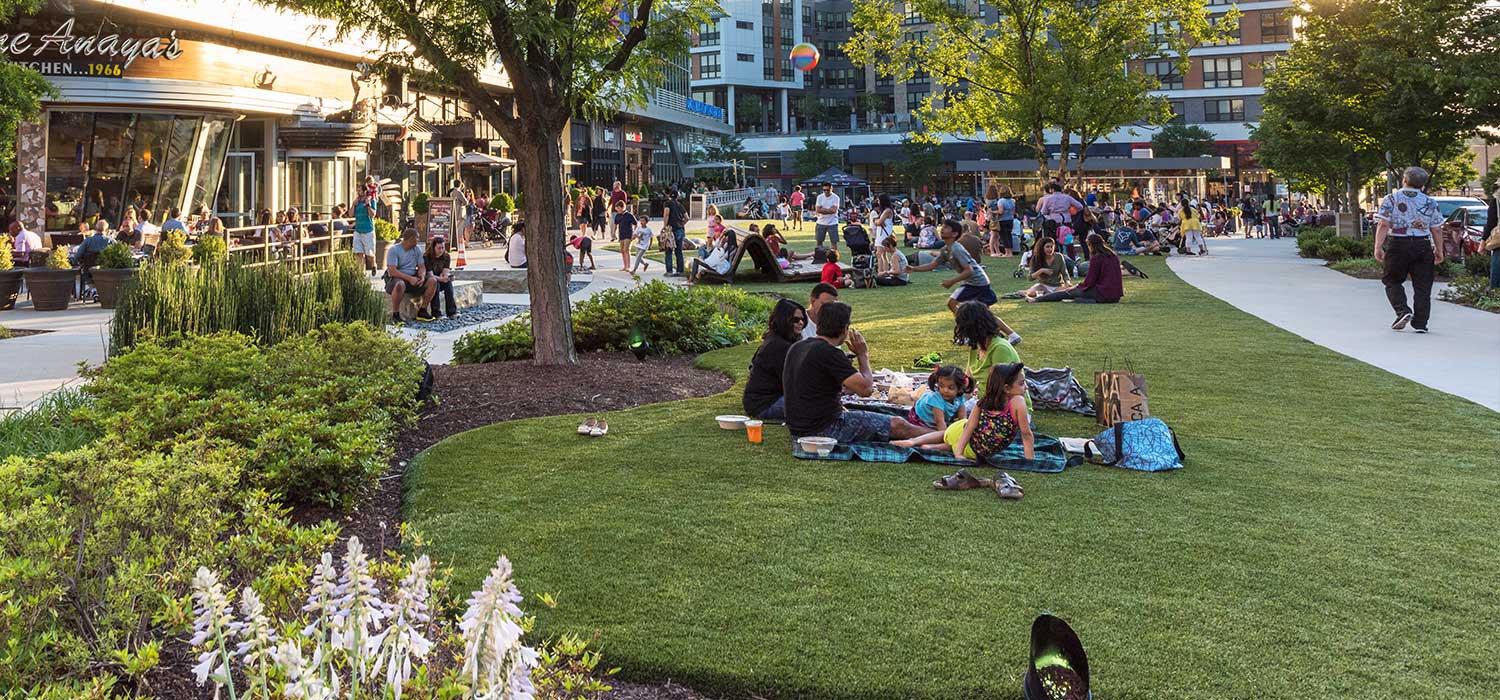 SUBURBAN SQUARE: In Ardmore, PA, our team worked with Kimco on creating multiple micro venues within five acres of the historic retail development, Suburban Square. Of the $70 million dollar reinvestment, roughly 7% went to landscape improvements that resulted in over 150,000 square feet of on-site public realm improvements. Included in those improvements was a 3,500 square foot upper courtyard which has been wildly successful in activating the space, even during covid times. During the conceptual design process, the courtyard was used to sign an anchor fitness tenant who now uses the open lawn throughout the year for group exercise and events. During the construction of the upper courtyard, the surrounding retail space was 100% leased. Overall, they saw a 3-5% increase in sales throughout the project after all improvements were made.