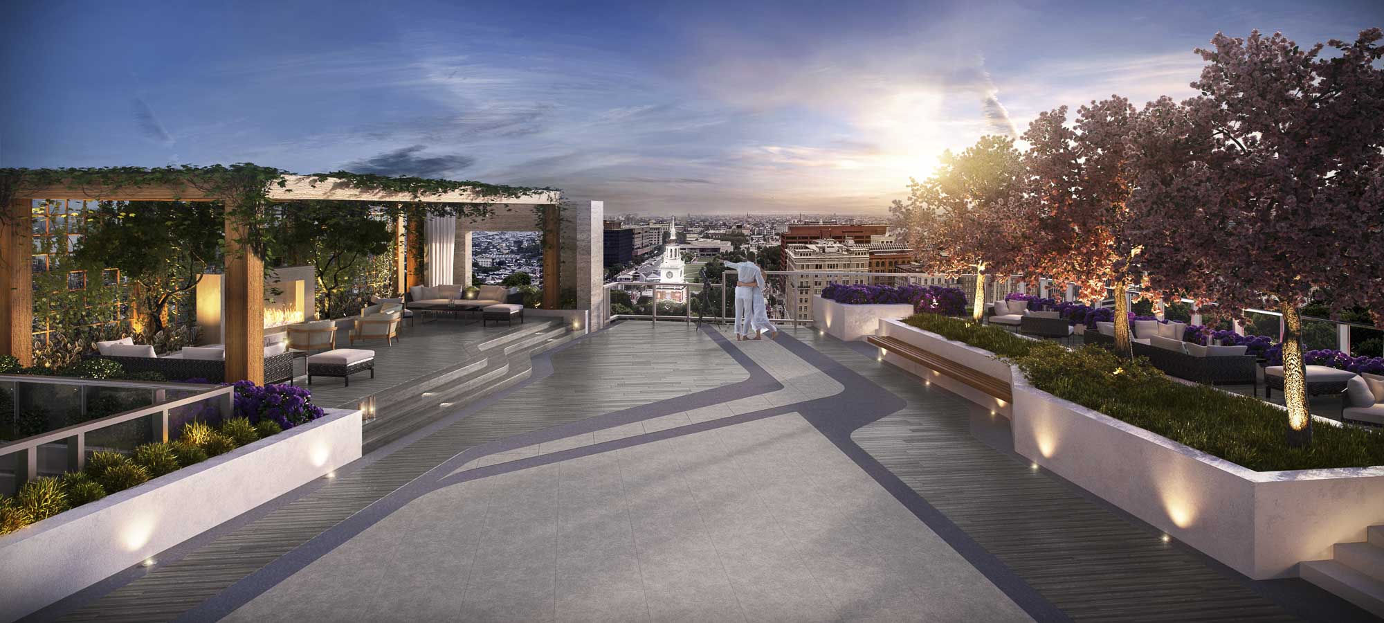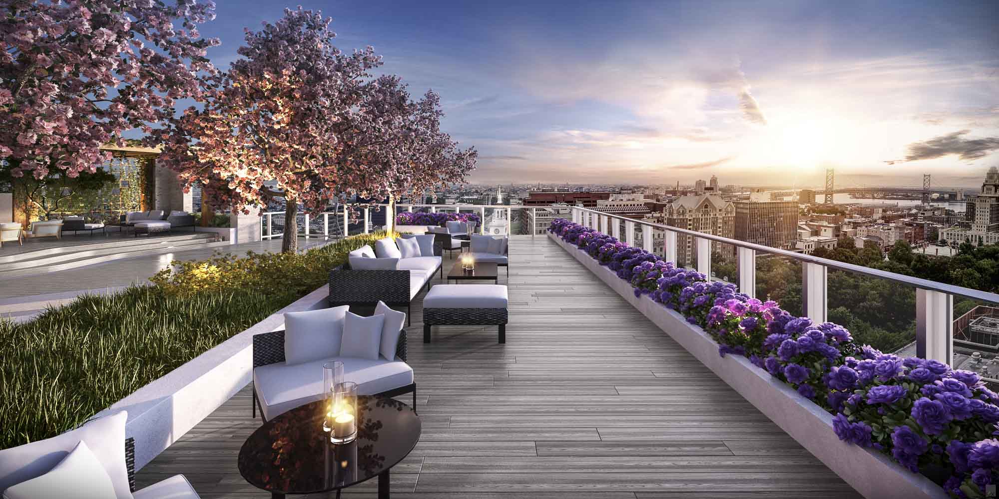 500 Walnut is a new ultra-luxury condominium tower overlooking the most historic site in the United States – Independence Hall. Initiated by Scannapieco Development Corporation, the project includes 30 residential build-to-suit condominiums above four stories of extensive amenities. Mahan Rykiel Associates designed the elevated terrace amenity spaces as well as the streetscape at ground level.Â