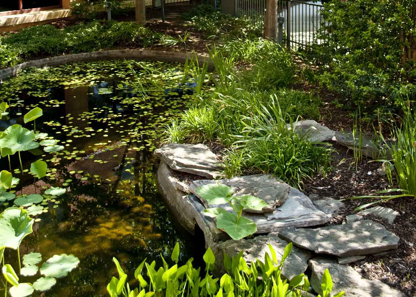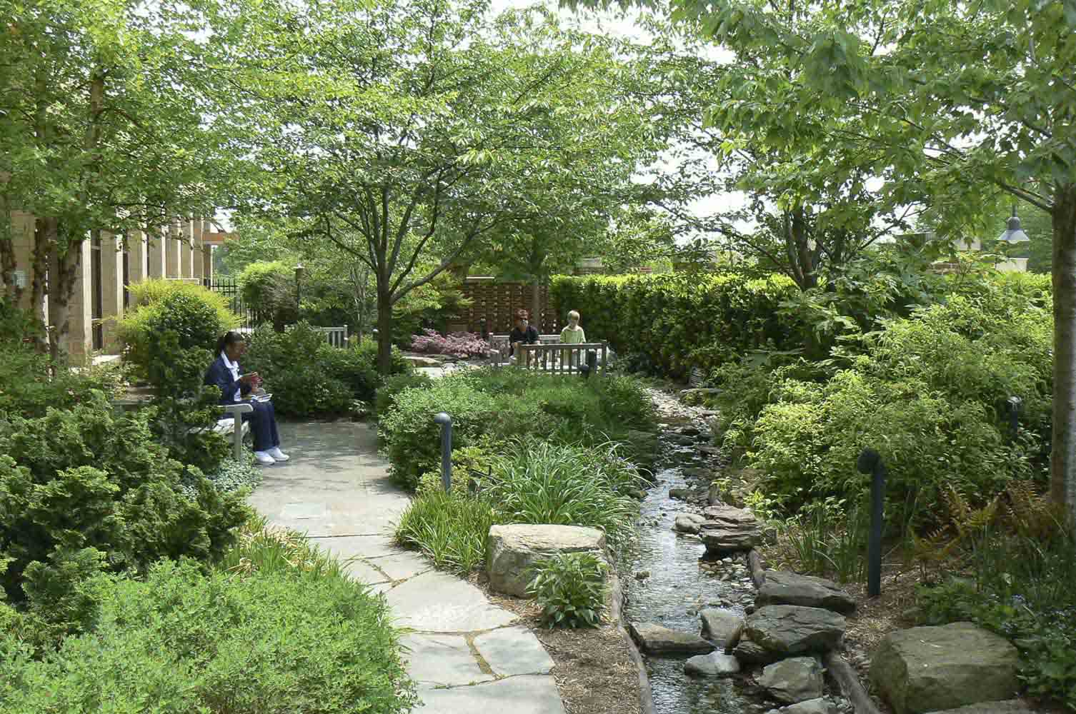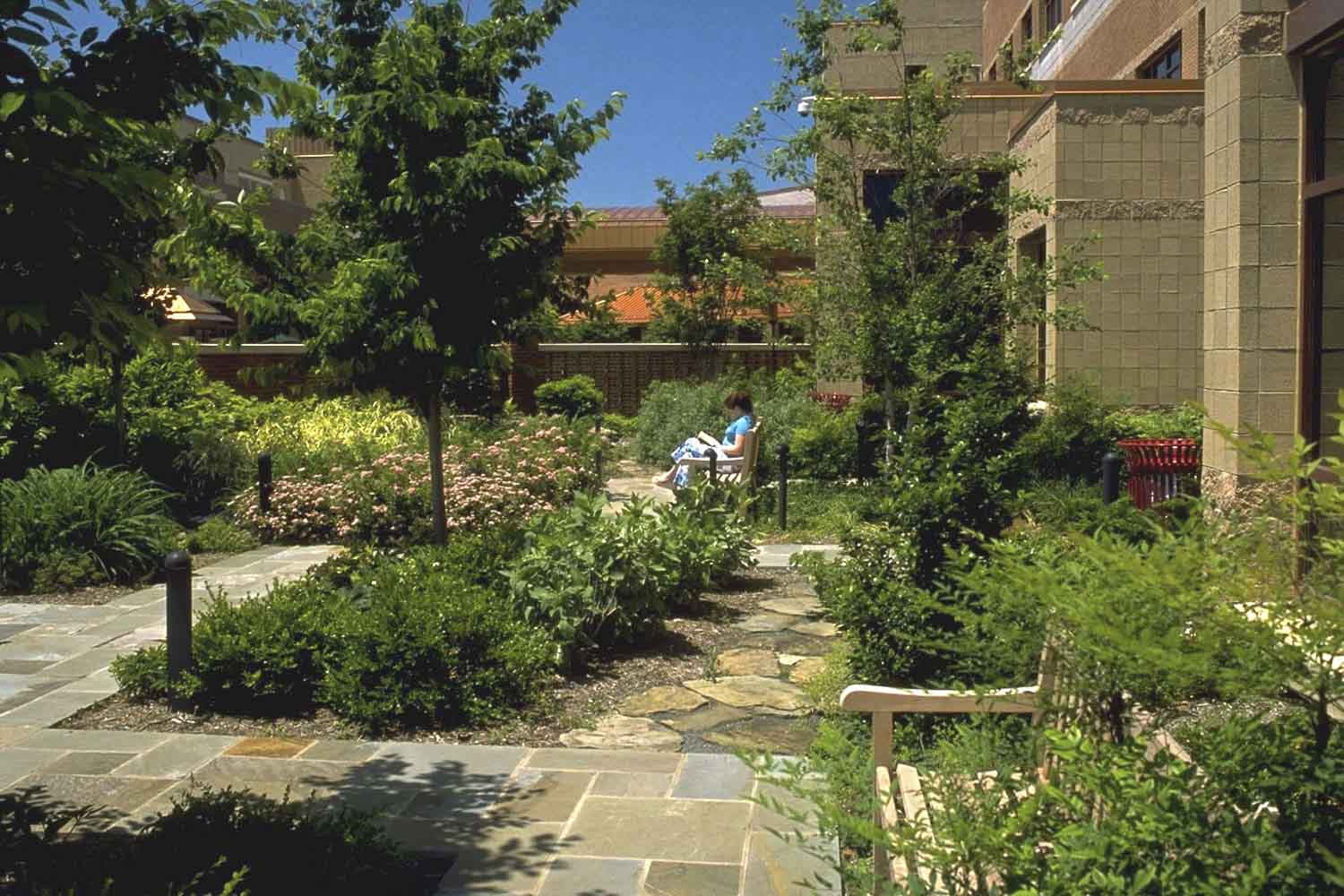 The garden provides multiple places to sit for individuals or small groups in areas that are close to the building or in more private areas. Plantings have four seasons of interest and attract birds and butterflies which animate the space and provide both distraction and focus for visitors. Surrounded by lush plantings and shaded by trees, the babbling water feature provides a natural connection to the adjacent Meditation Center and represents the hospital’s holistic approach toward healing.