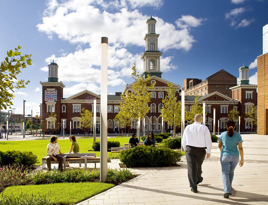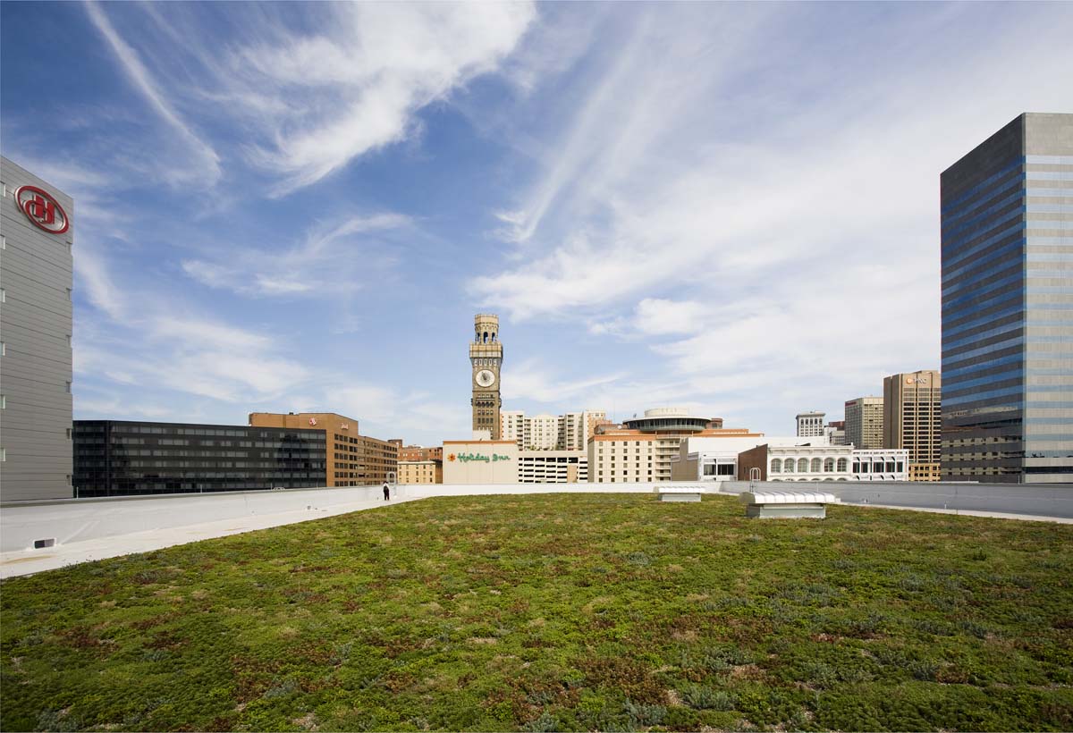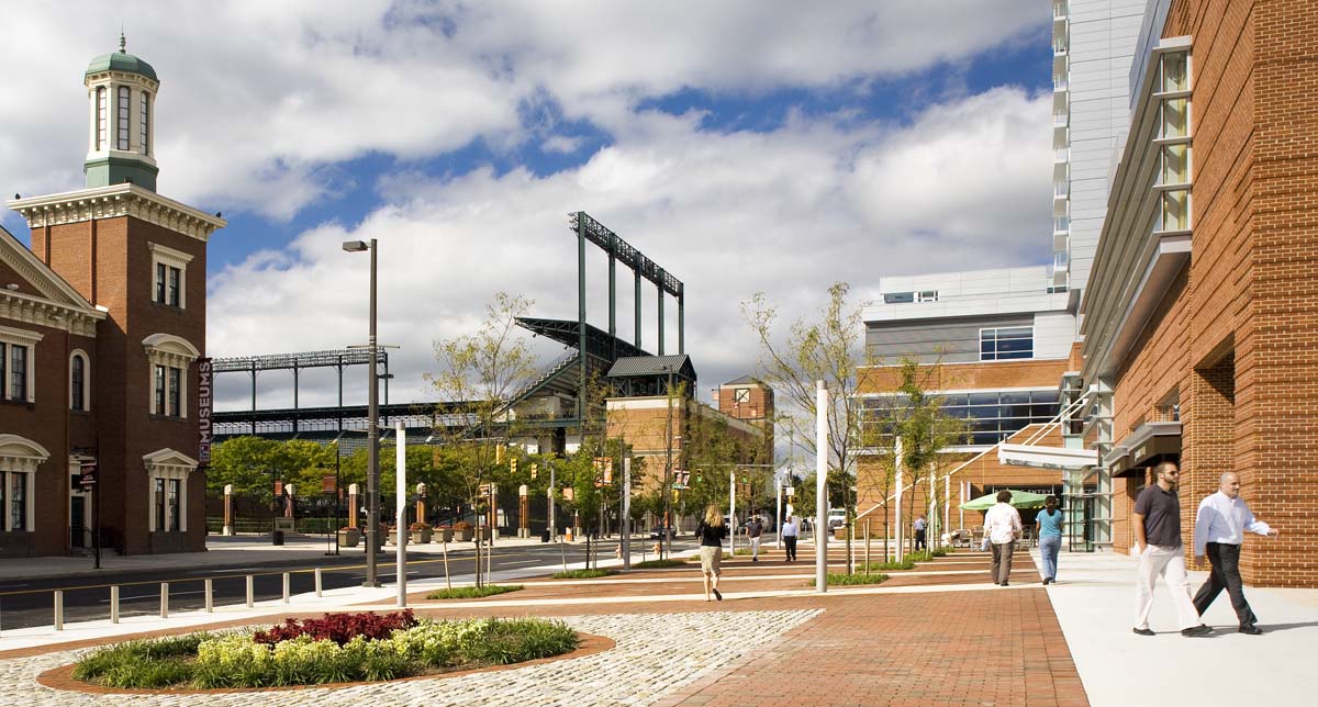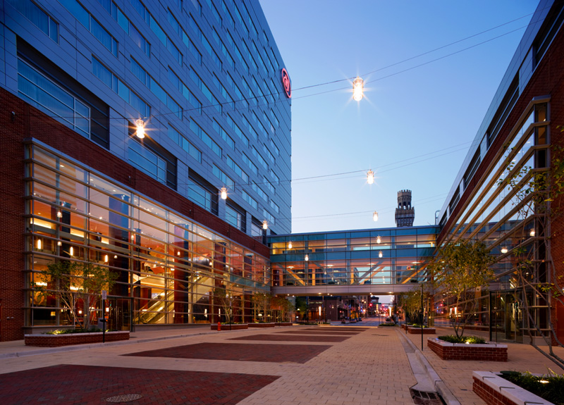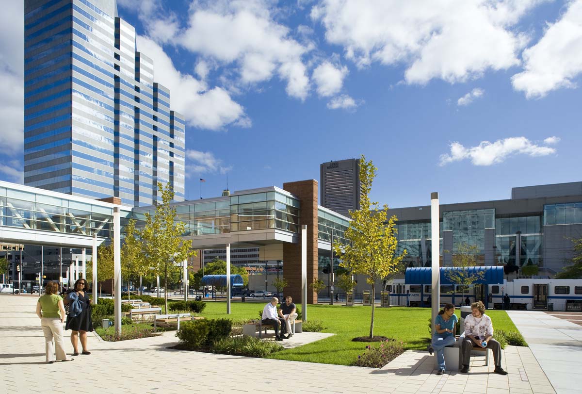 The Convention Center Hotel occupies a full city block on Pratt Street, Baltimore’s premier downtown and waterfront address. It overlooks Camden Yards, home to the Baltimore Orioles. The plaza at Howard Street accommodates an upgraded light rail transit station and has become the “gateway” to the ballpark from downtown. The generous pedestrian promenade coupled with green space and seating opportunities, is filled with activity after a game at The Yard. Mahan Rykiel’s urban design experience and attention to detail brings a fresh approach to this urban landmark. Prior to the hotel construction, the existing site was an expansive surface parking lot. Working closely with the design team, MRA was able to improve storm water infiltration into the Chesapeake Bay watershed by creating ample landscape and open spaces. The project also includes one of the largest vegetated roofs in the state of Maryland.