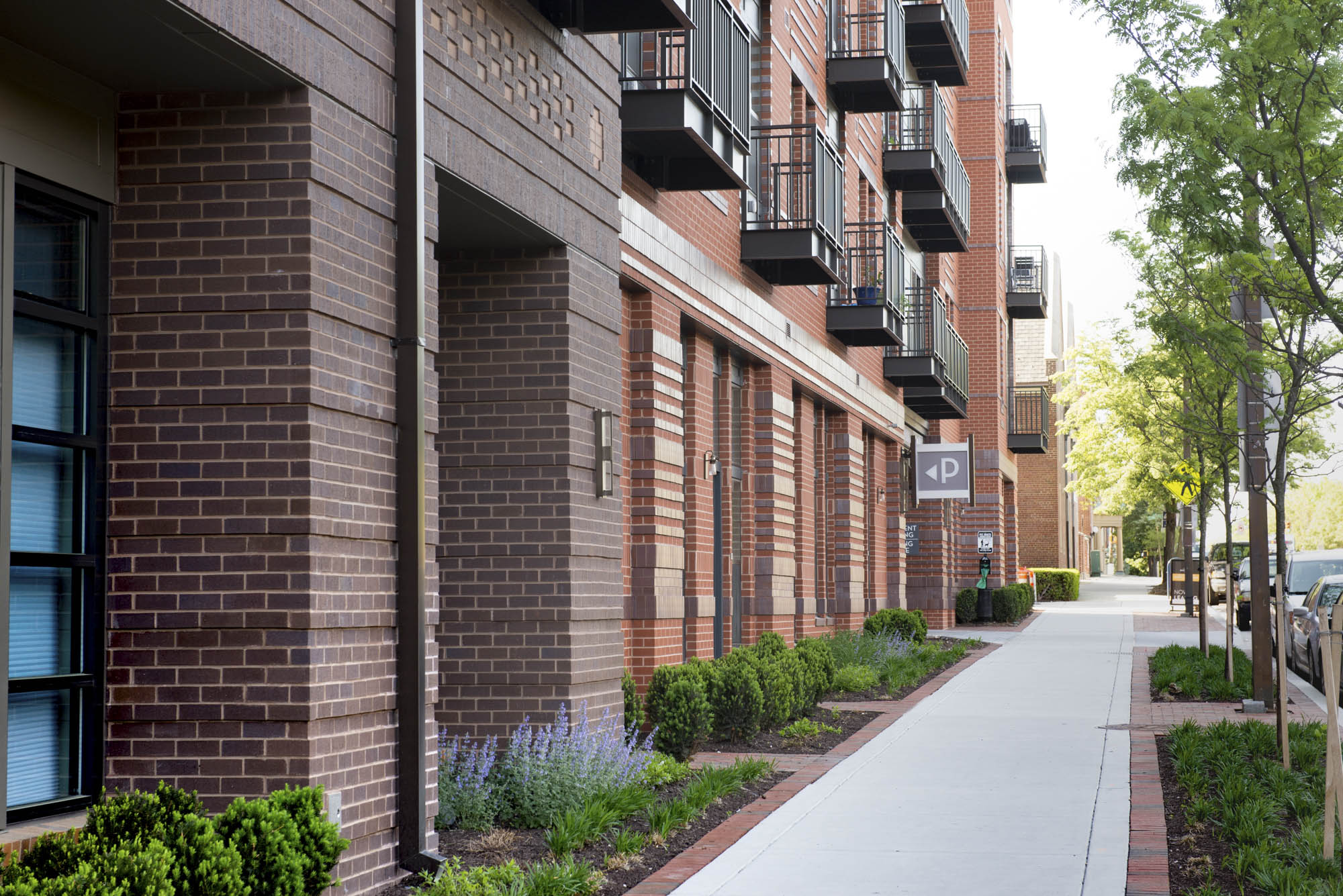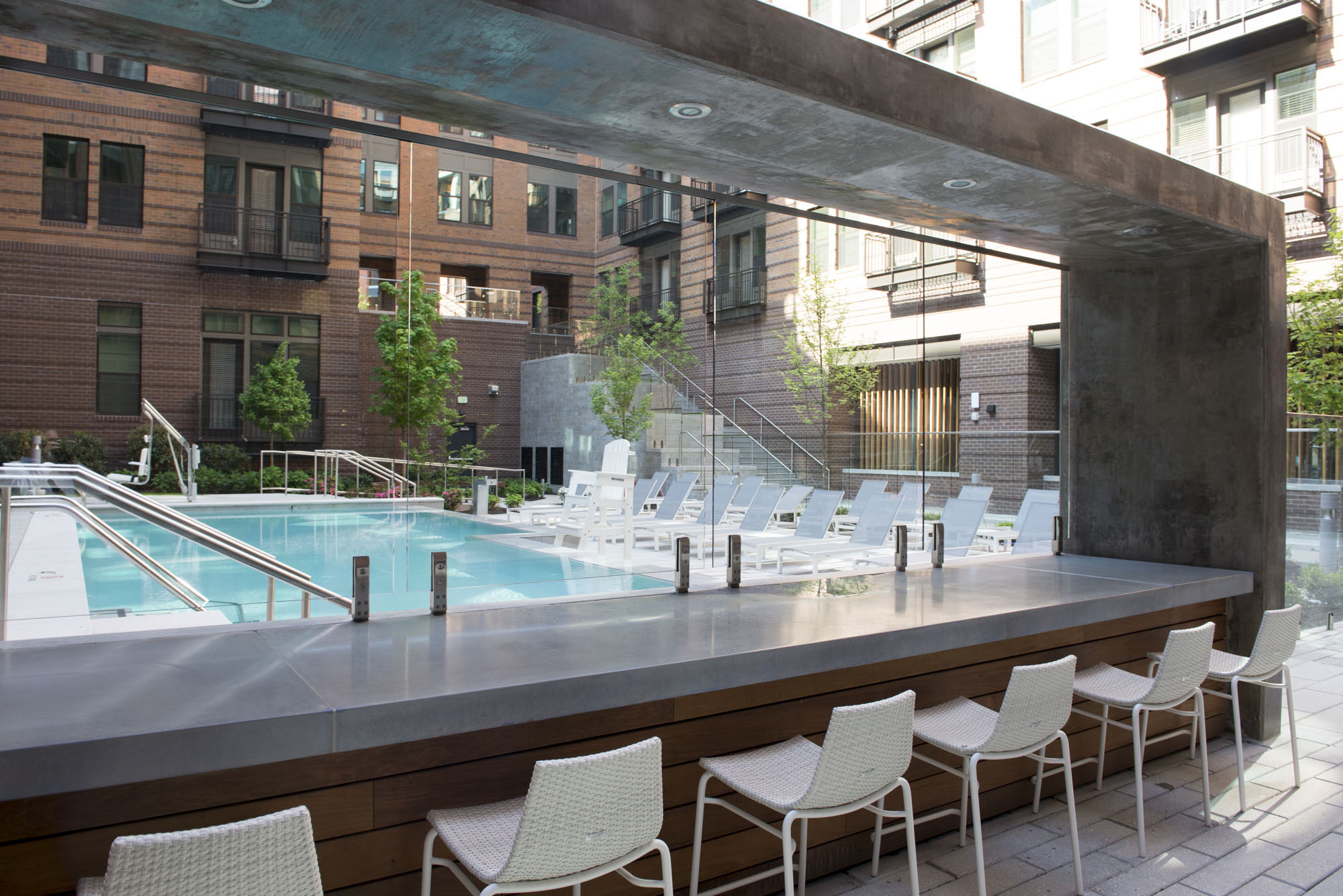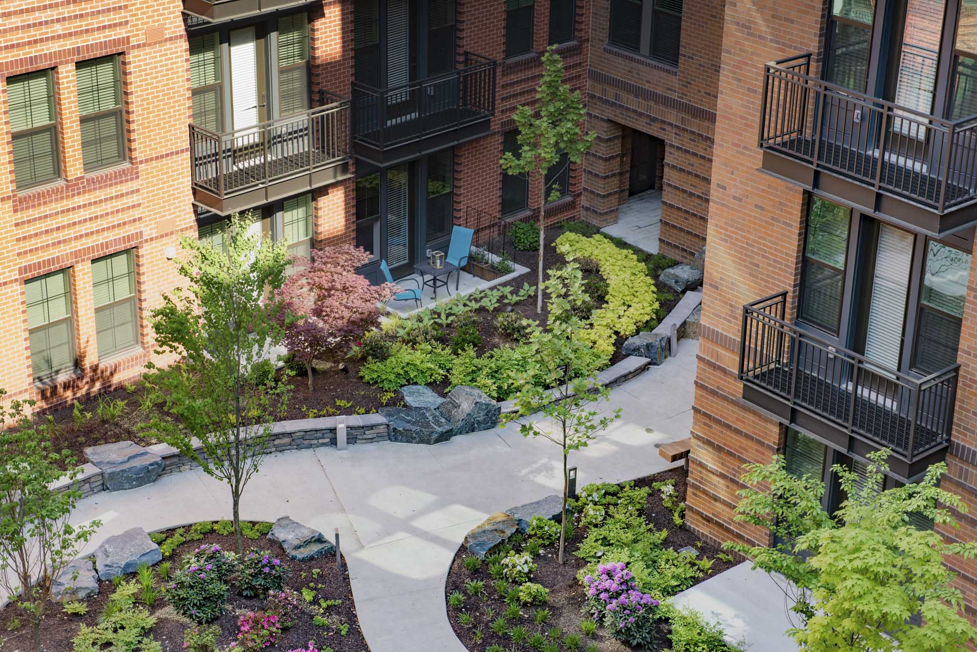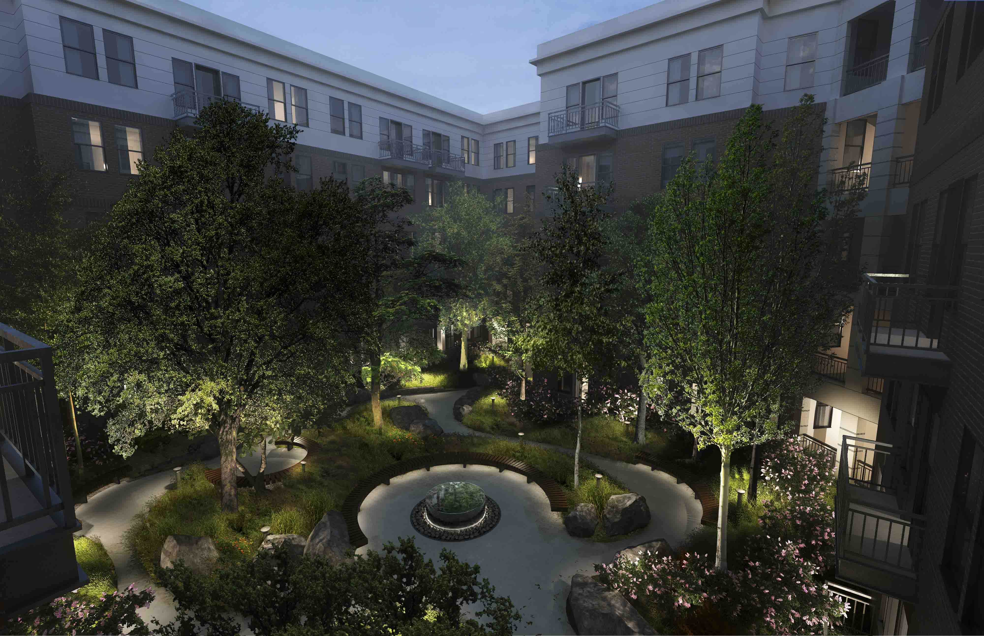 Banner Hill Appartments is a 349-unit luxury apartment building nestled between the Otterbein Neighborhood and the Inner Harbor in Baltimore, MD. Mahan Rykiel Associates was tasked with the design of the surrounding streetscape, a public/private plaza, as well as a two-level residential courtyard. The lower terrace of the courtyard features luxury amenities such as a zero edge pool, multiple grilling stations, an outdoor fireplace, and a bocce court with amphitheater style seating for residents to enjoy. The upper terrace includes a passive garden, providing a tranquil place of respite and relaxation for residents as they weave through the densely vegetated garden, centered around a feature granite fountain. Additionally, the project hosts a ½ acre public/private plaza featuring a misting fountain, and terraced lawn panels with flexible open space. The plaza also pays homage to the site’s history by featuring a salvaged sculpture from the University of Maryland Hospital Building, which previously occupied the site.
