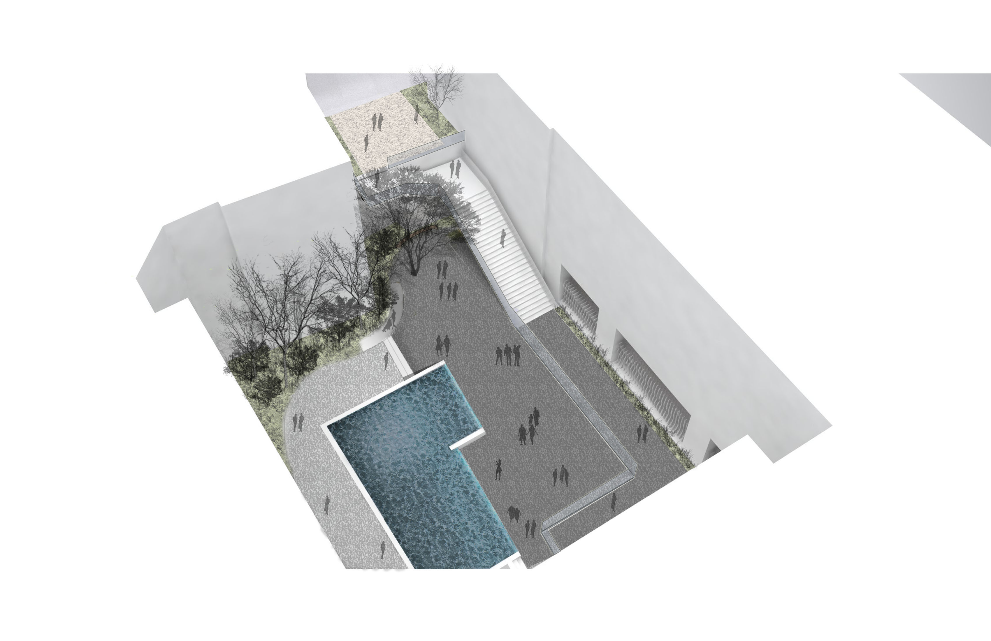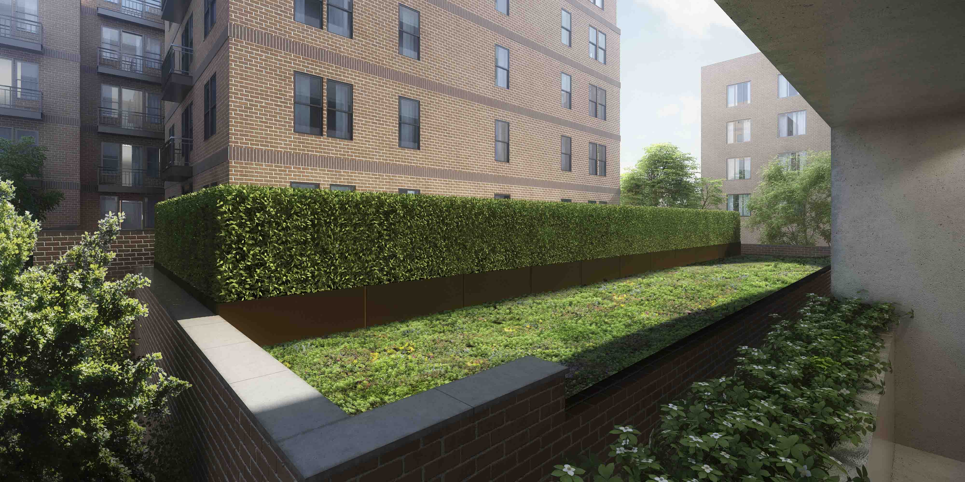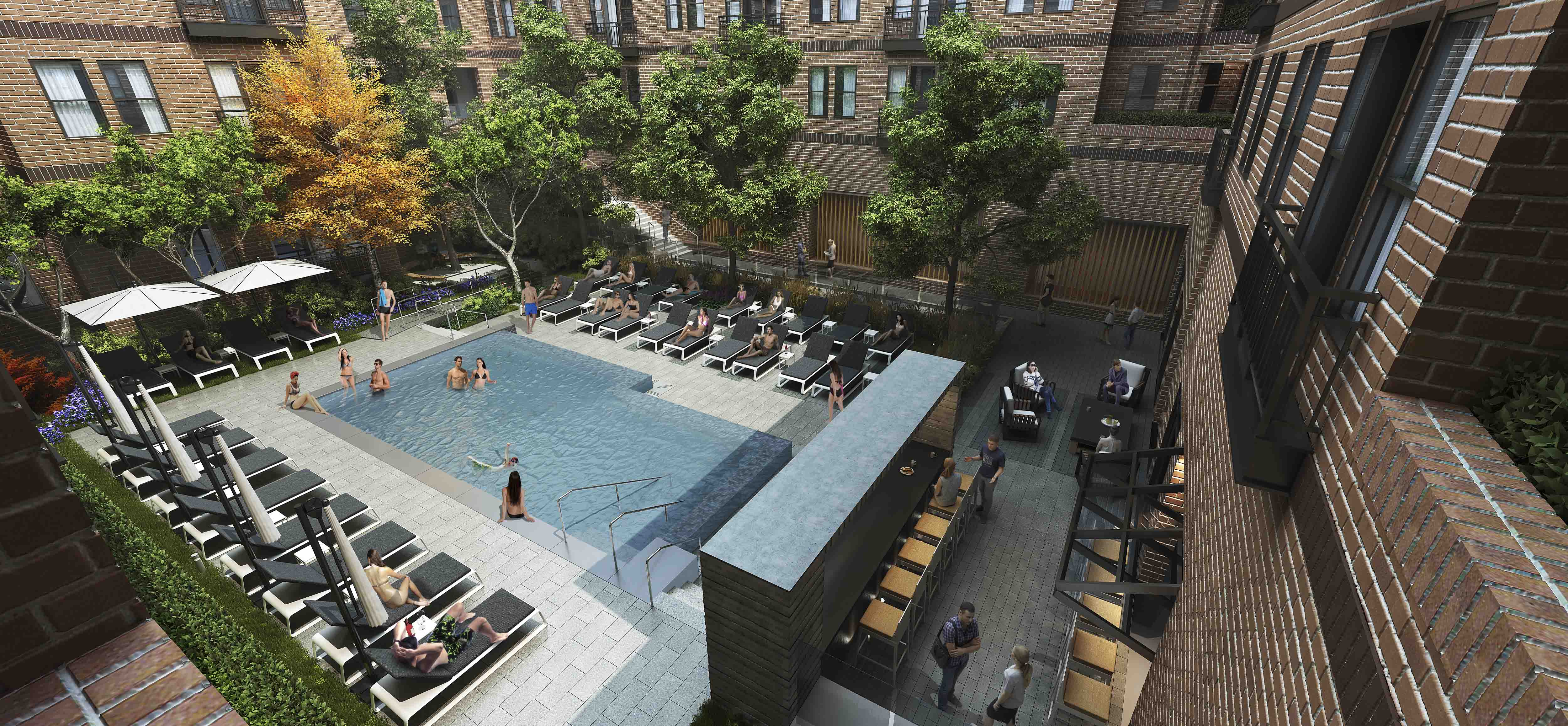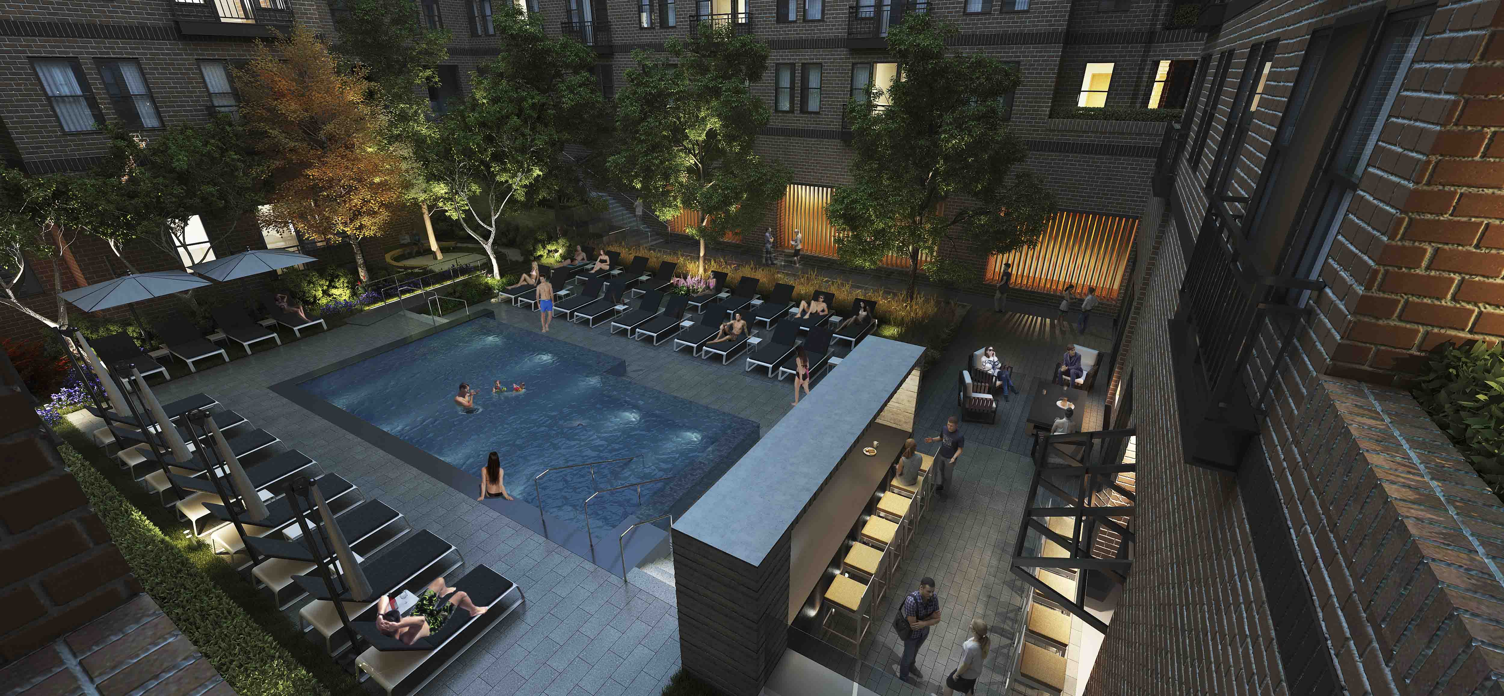 Banner Hill Appartments is a 349-unit luxury apartment building nestled between the Otterbein Neighborhood and the Inner Harbor in Baltimore, MD. Mahan Rykiel Associates was tasked with the design of the surrounding streetscape, a public/private plaza, as well as a two-level residential courtyard. The lower terrace of the courtyard features luxury amenities such as a zero edge pool, multiple grilling stations, an outdoor fireplace, and a bocce court with amphitheater style seating for residents to enjoy. The upper terrace includes a passive garden, providing a tranquil place of respite and relaxation for residents as they weave through the densely vegetated garden, centered around a feature granite fountain. Additionally, the project hosts a ½ acre public/private plaza featuring a misting fountain, and terraced lawn panels with flexible open space. The plaza also pays homage to the site’s history by featuring a salvaged sculpture from the University of Maryland Hospital Building, which previously occupied the site.
