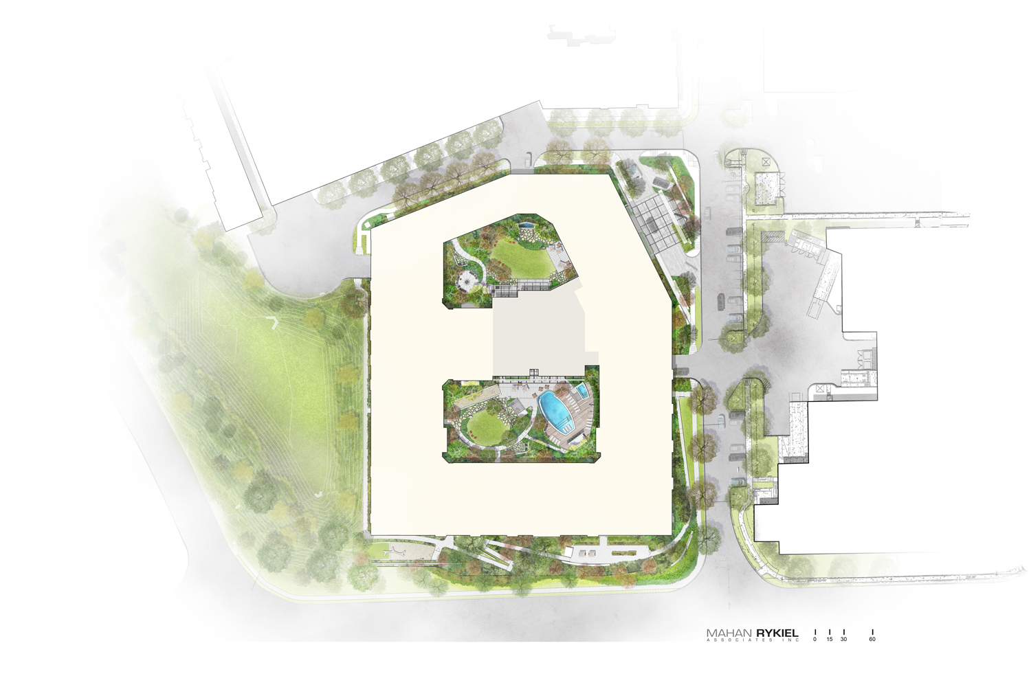 The scope included schematic design through implementation for two courtyards, entry drop-off, a southern amenity for residents and their pets as well as site landscape for the building.
