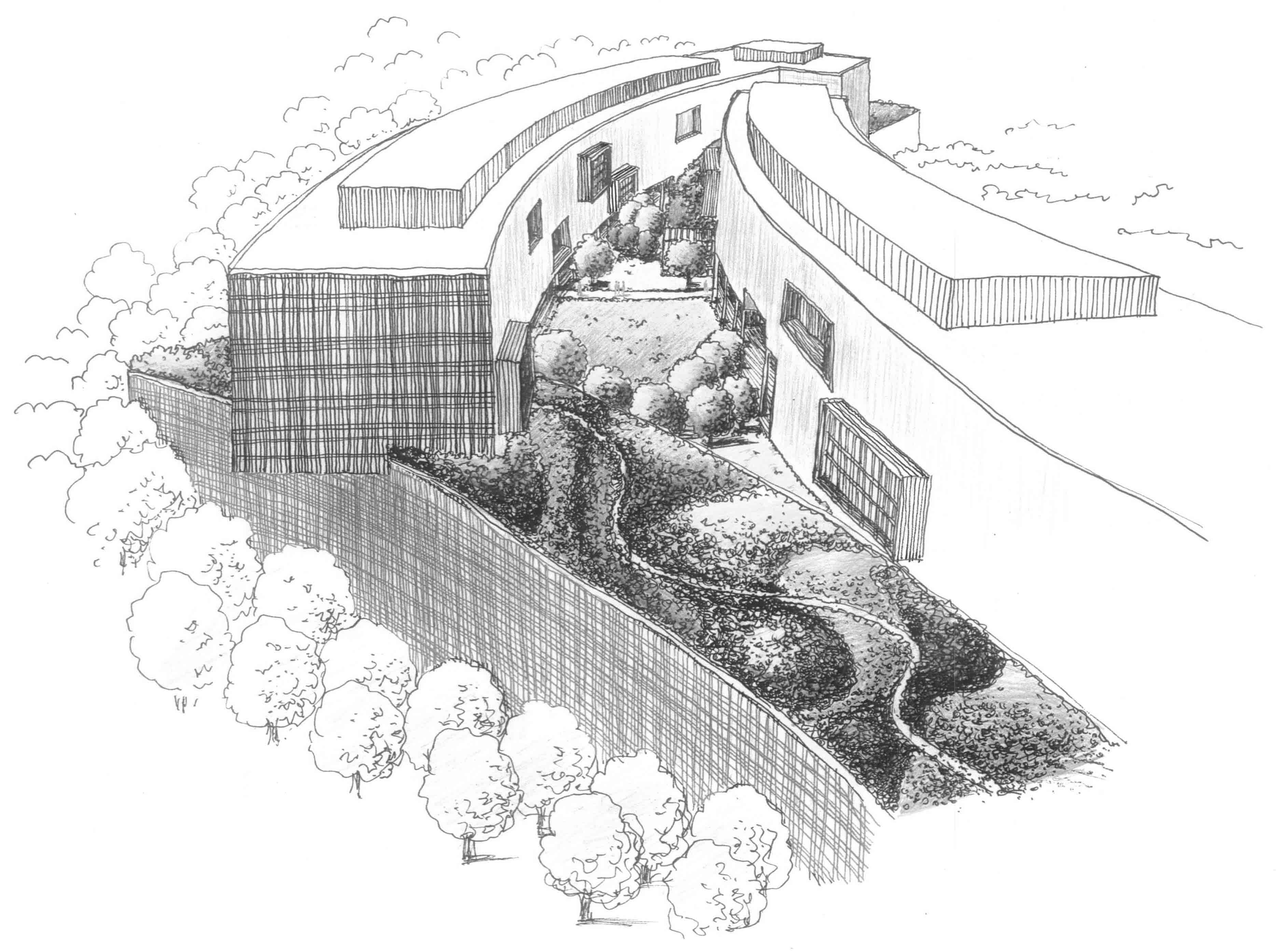 The complex consists of two curved wings on a one-story monolithic base connected above by a walkway. The two wings curve over and around garden courtyards, with 70,000 sf of green roof above the 4th and 5th floors. The at-grade garden is also a green roof as it is located above the parking garage. Two parking garages accomodate 3,098 cars.