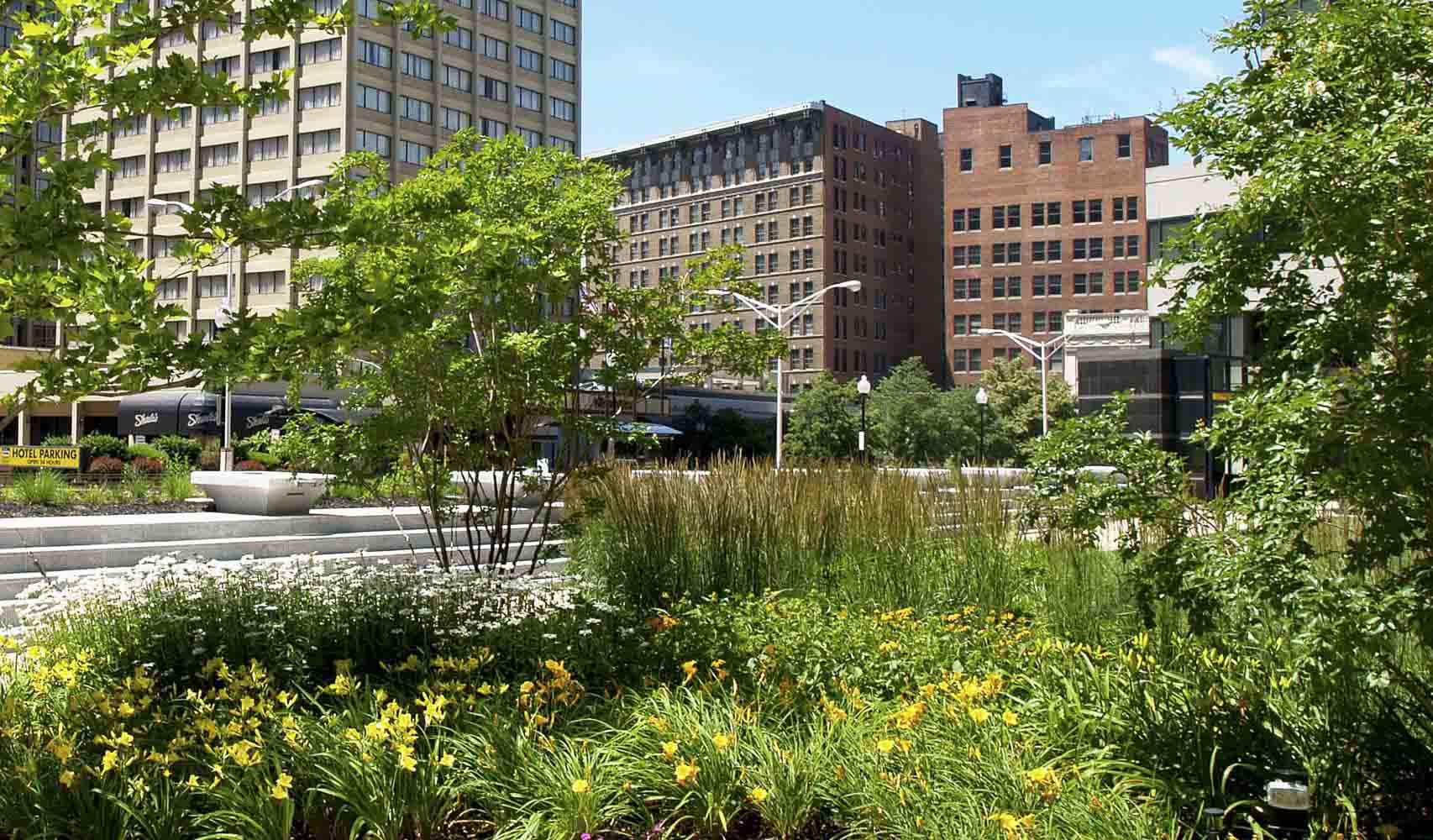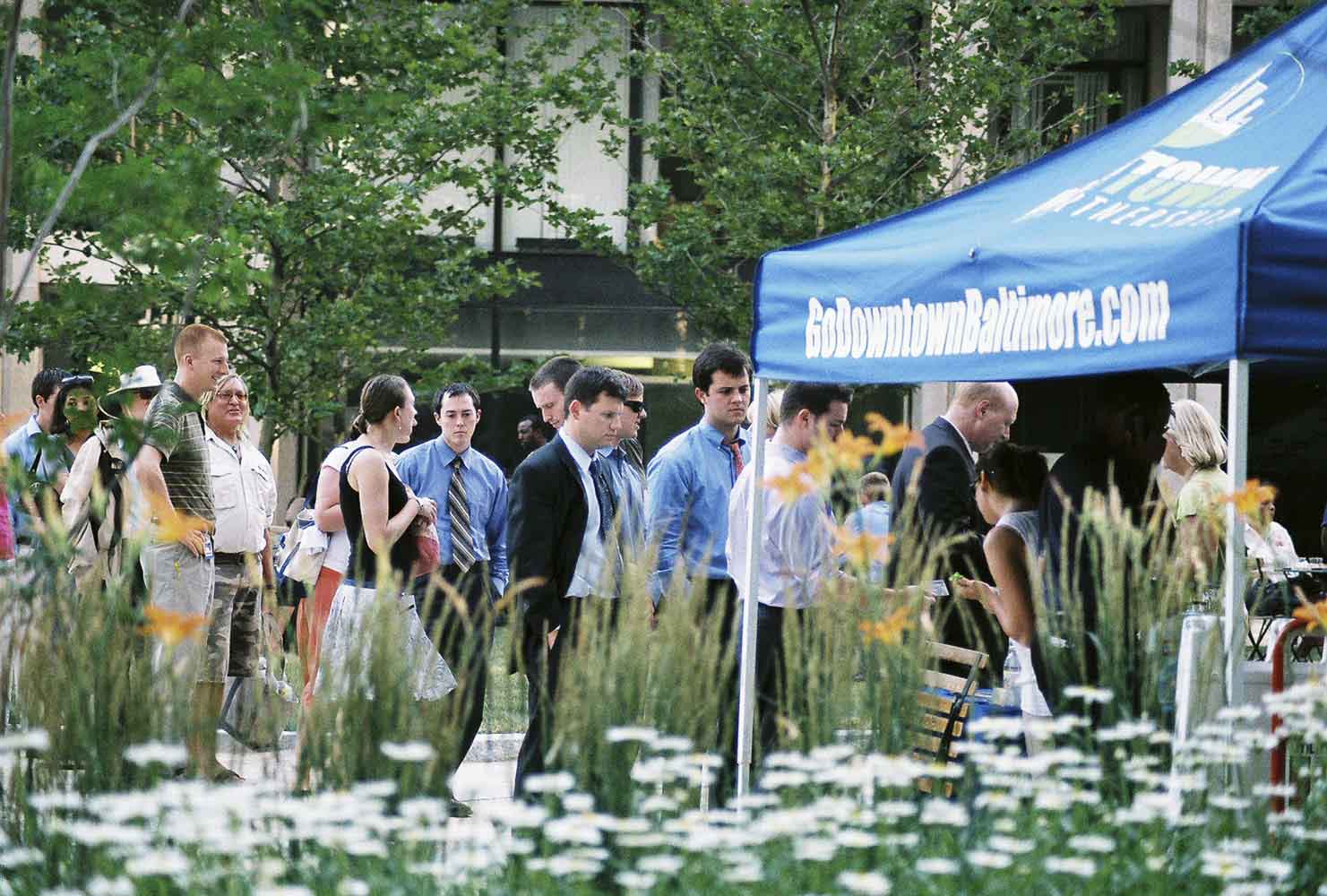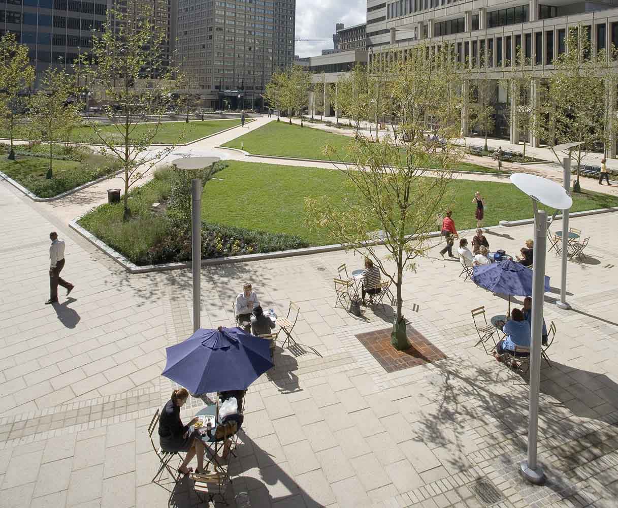 Center Plaza, part of Baltimore’s Charles Center, was a keystone of Baltimore’s downtown revitalization efforts in the 1960’s. One of Baltimore’s original “green roofs,” by the 1990’s the plaza had deteriorated into an unattractive, unused space that adversely affected the surrounding buildings. City leaders recognized the three-acre site served as a vital link between City Center, the West Side, and the Charles Street Corridor as more than 8,100 office workers, 2,000 residents, and 1,500 hotel rooms could be found within a one-block radius.