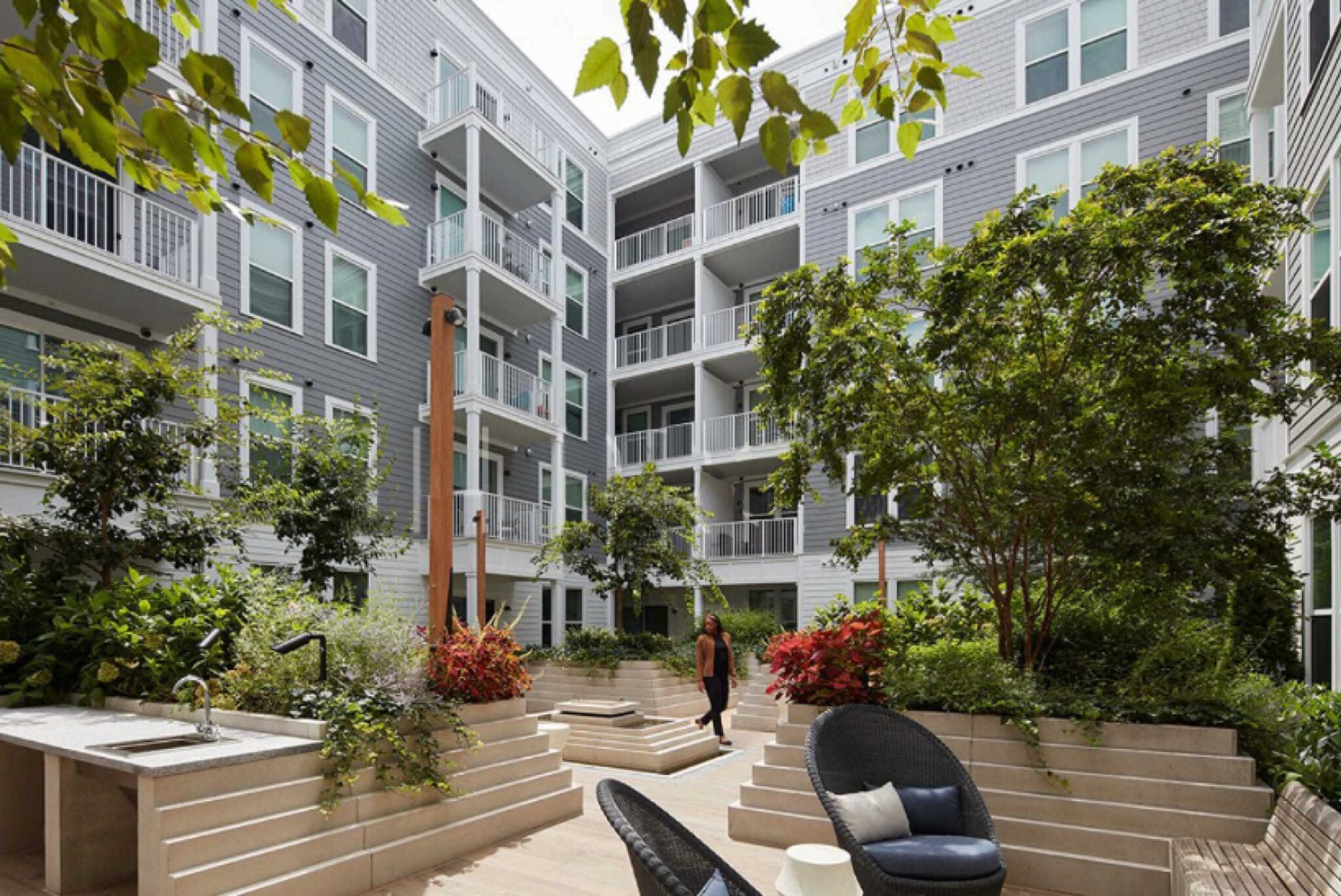 The passive North Courtyard draws inspiration from the waves of Chevy Chase Lake itself, dividing space with layered planter boxes that create smaller outdoor “rooms” for residents to gather with family to relax and reflect. Filled with native, shade tolerant plants, these raised planters also act as bioretention planters.
