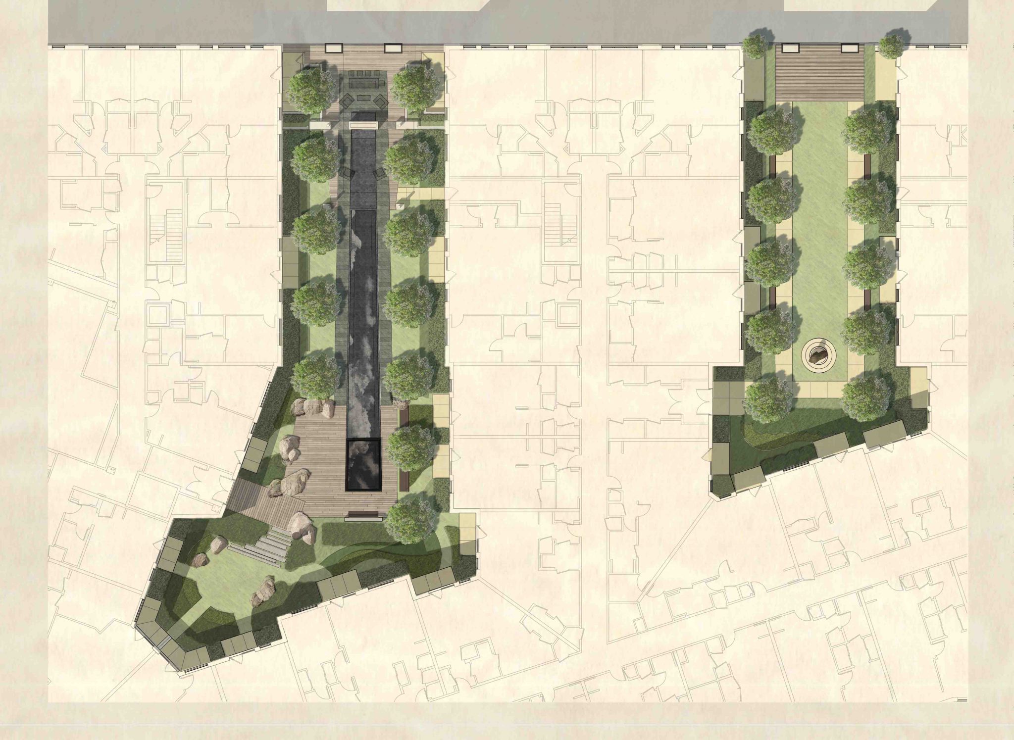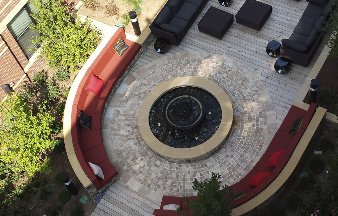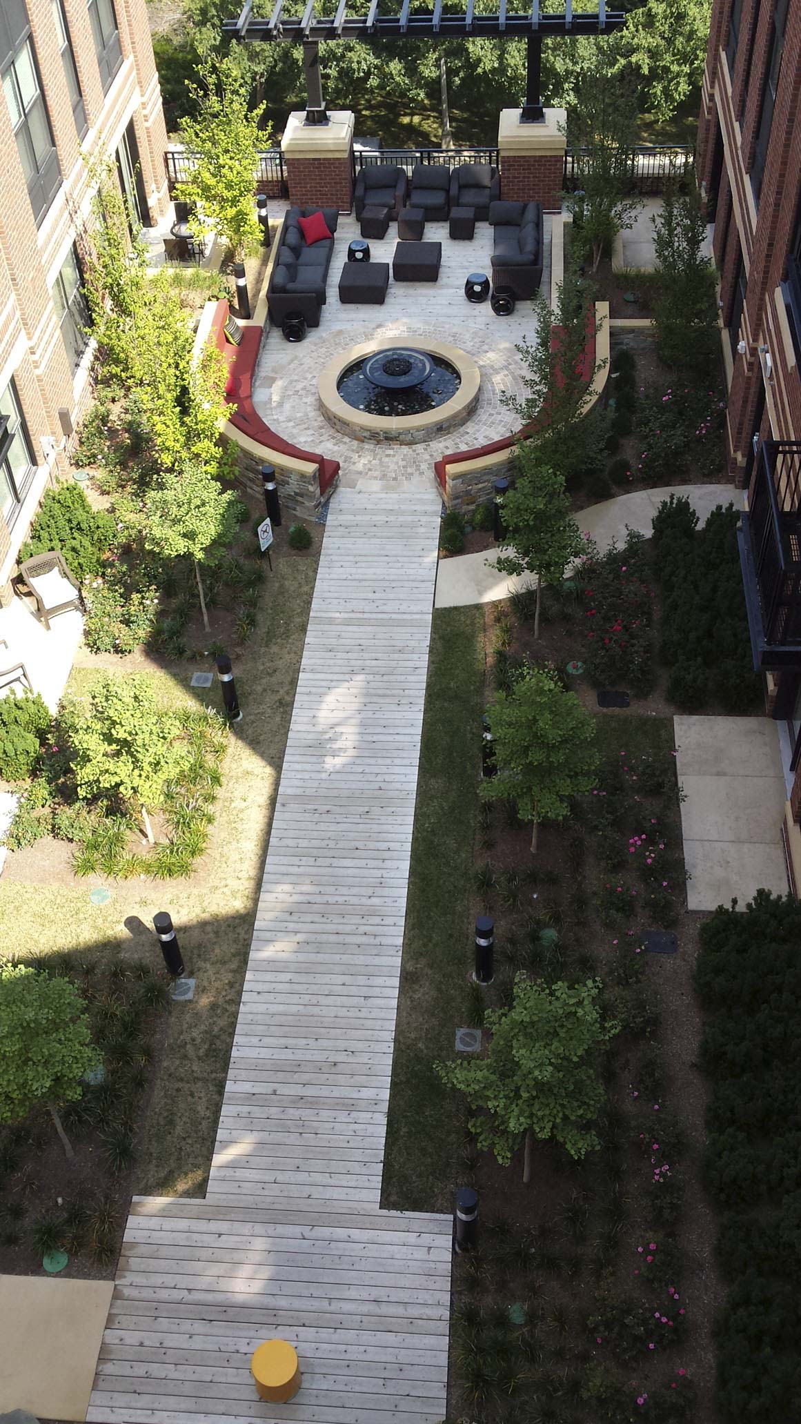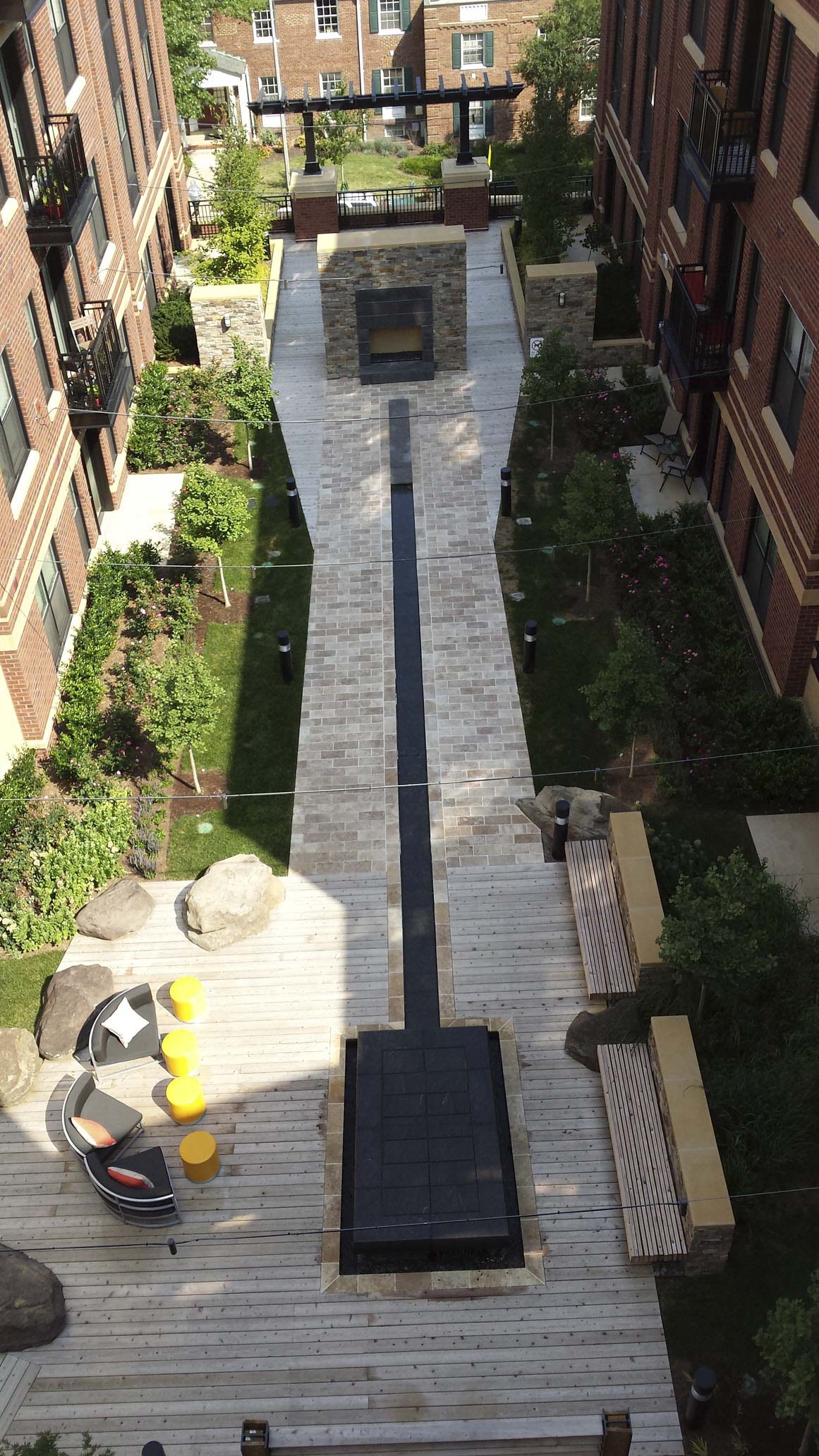 The design took advantage of the linear character of the courtyards by creating focal points and view corridors. Meanwhile, a variety of landscape elements such as a runnel fountain, fire pit, trellis, vertical walls, and outdoor kitchen were designed to break up the narrow space and provide the user unique experiences in separate but contiguous spaces.