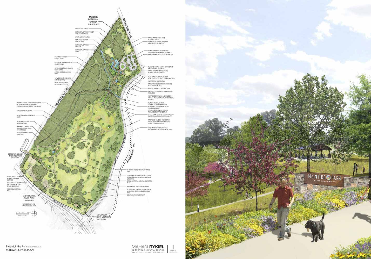 East McIntire Park comprises nearly 80 acres of passive open space north of the downtown Charlottesville area, centrally located within the urban ring of the City and Albermarle County. Mahan Rykiel is providing landscape architectural services for the phased conversion of a pasture golf course to natural open space and trails, as well as the preliminary park elements and infrastructure, a family activity center, and botanical garden. Part of the greater 150-acre regional McIntire Park bisected by the Norfolk Southern Railroad, the eastern area balances the active recreation uses of its western side.