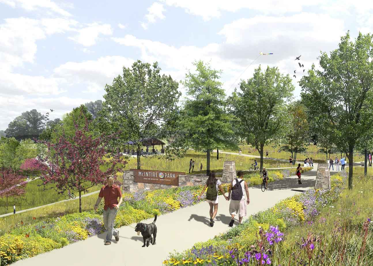 Originally a cattle farm, East McIntire Park was initially planned around the site’s steep topography and two streams. A rolling Piedmont landscape with open fields and a mix of farmland succession, the park features a central hilltop with a large stand of trees. The westward-flowing steams enter from underneath the railroad line, and join each other before leaving the park. The natural characteristics of the park create an excellent habitat for wildlife. Currently in design, the East McIntire Park project goals include:
