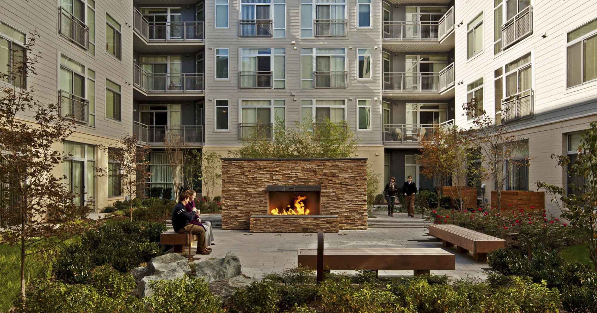 The private courtyard within the building functions as an outdoor living room for residents and includes a fire place, outdoor dining area, and special lighting. Seating areas are separated by a bamboo grove and small fountain.
