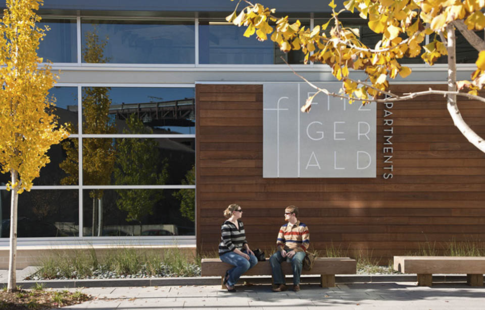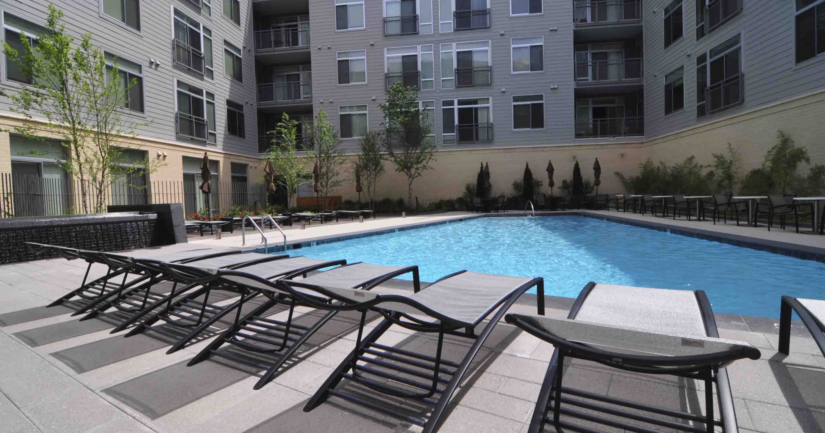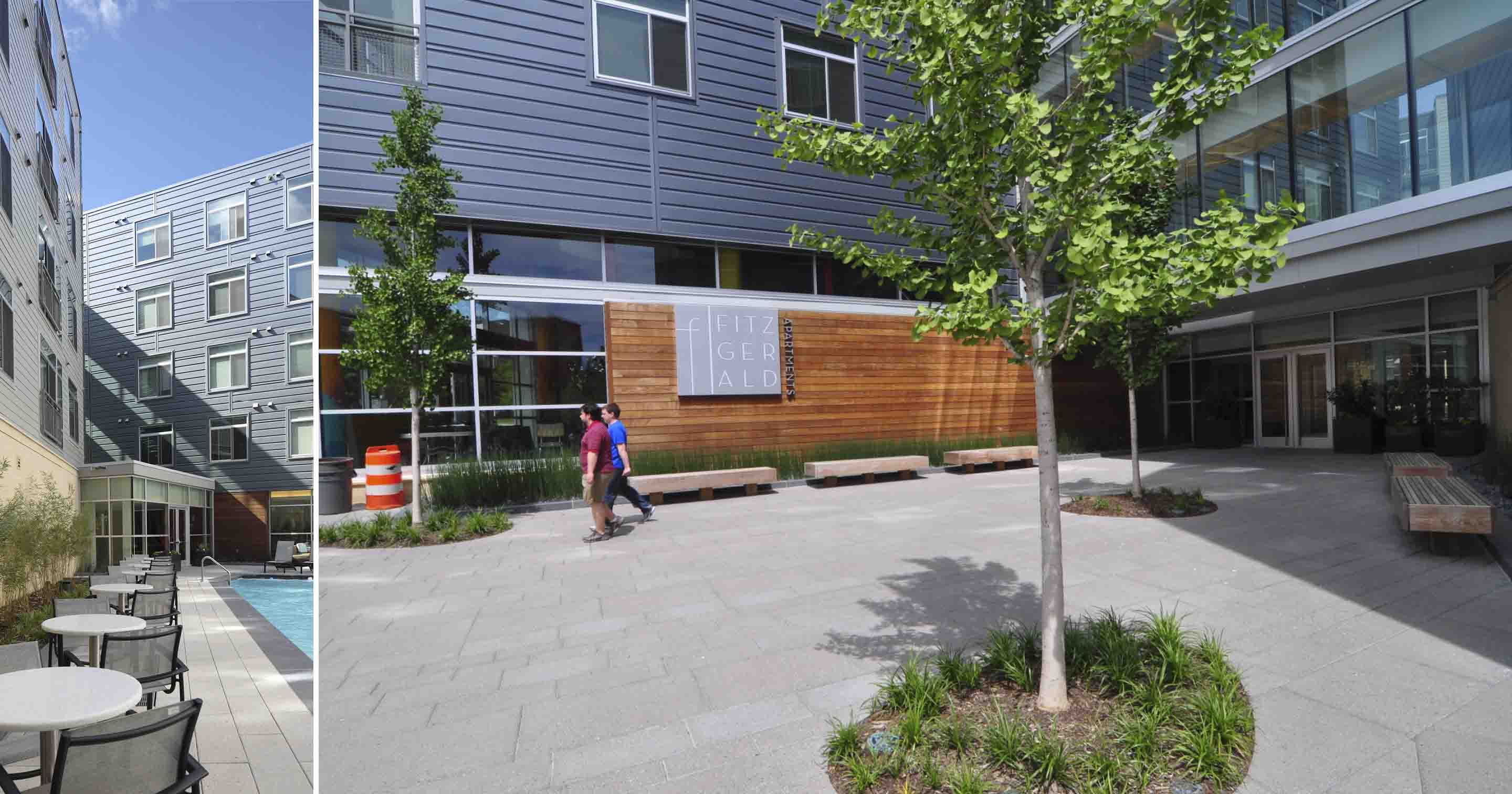 Nestled in the heart of the apartments are two distinct courtyards. The Pool Courtyard is visible from the main building entrance, and includes a water wall, pool fountain jets and special paving to articulate the main pedestrian route. Lush planting provides privacy to the apartment units and screens the adjacent retail.