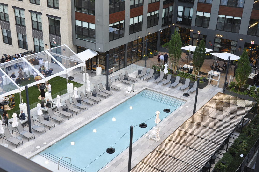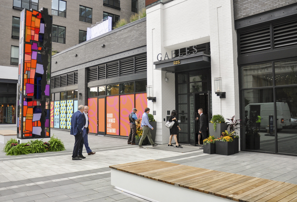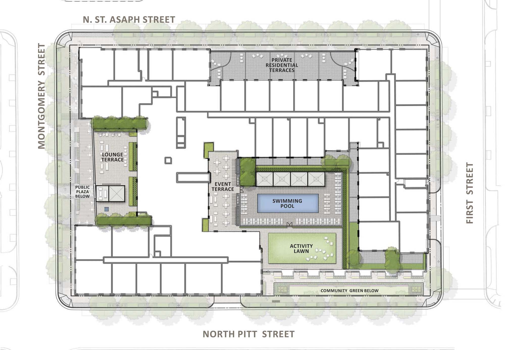 A public plaza anchors the retail offerings, with a central water feature and art element around which outdoor dining will be placed. Three individual roof top amenity decks will be offered to residents of the projects, which will offer pool spaces, activity terraces and informal garden areas.