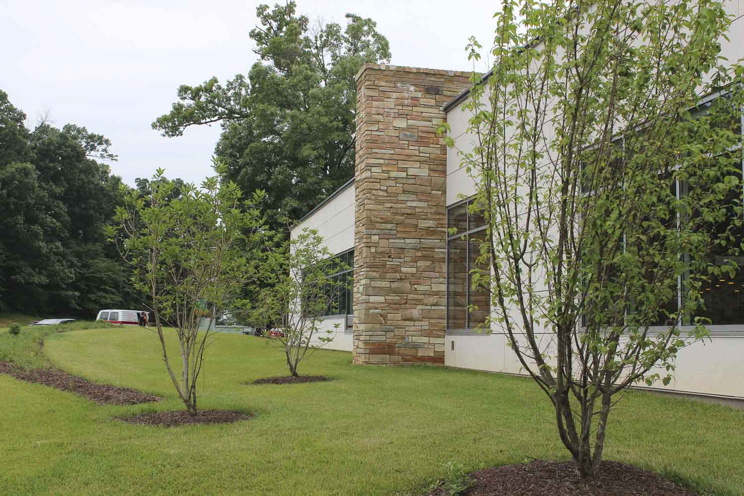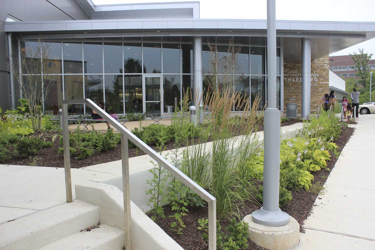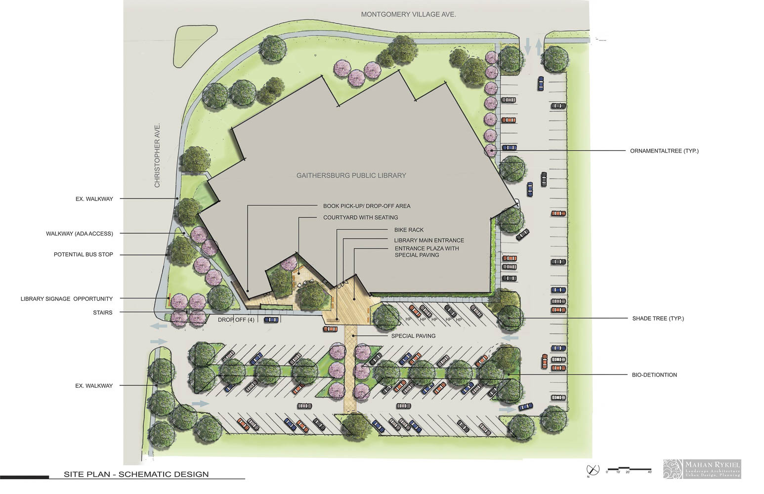 The landscape plan includes renovation of the entire site, but focuses especially on the entrance area of the expanded library. A number of mature shade trees were identified and protected for incorporation into the new plan. The entrance includes a pedestrian book drop and new garden which is visible through a glass curtain wall in the library lobby. This garden provides visitors with a welcoming green space for small group reading programs and includes new furniture, special paving and lush plantings.