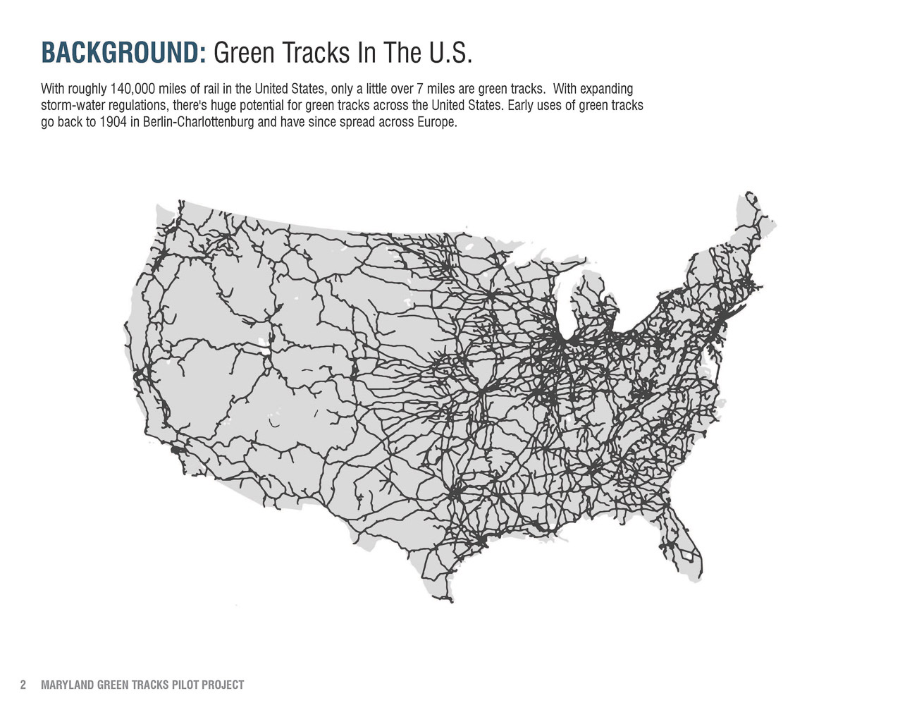 More than 140,000 miles of rail exists in the United States and only a little over 7 miles are green tracks. As storm-water regulations expand and rail infrastructure increases, this data provides valuable research for installing green tracks across the United States.