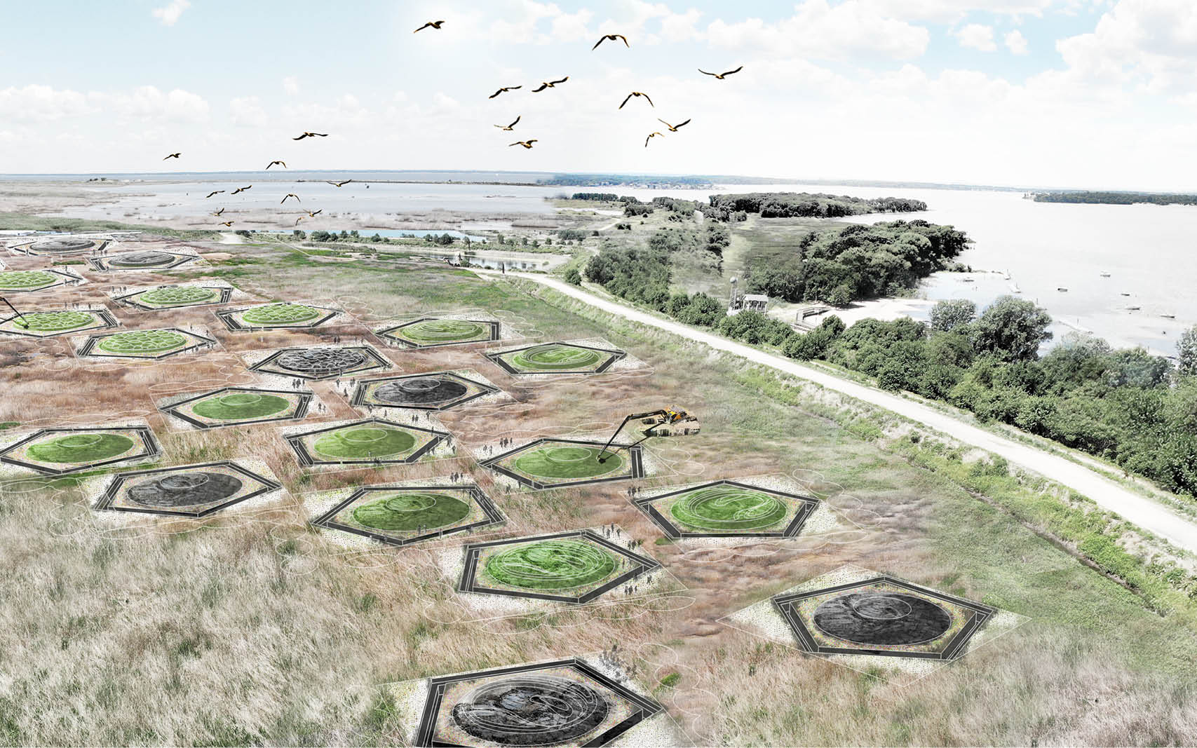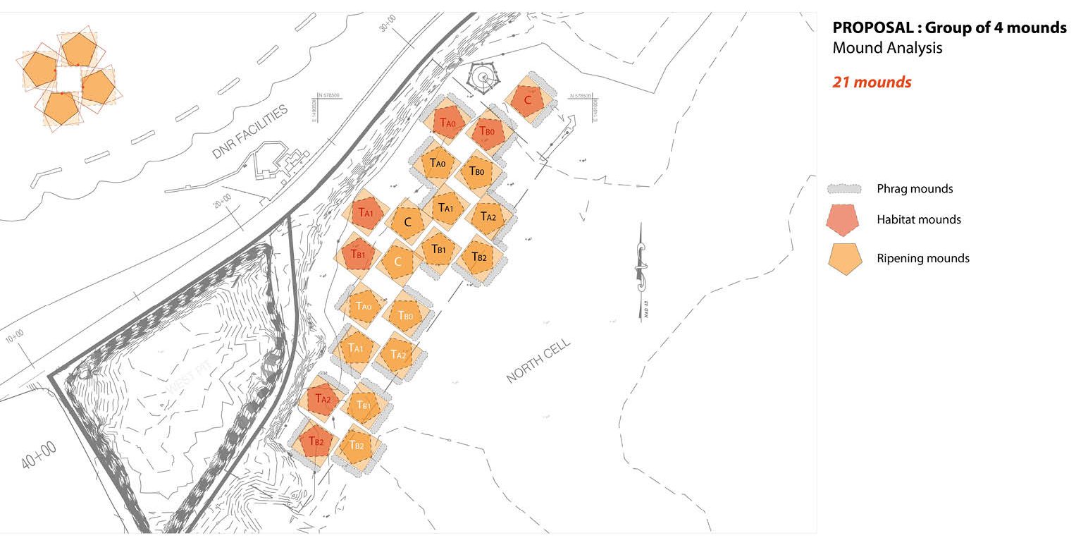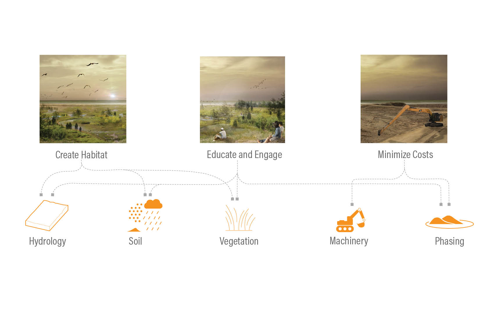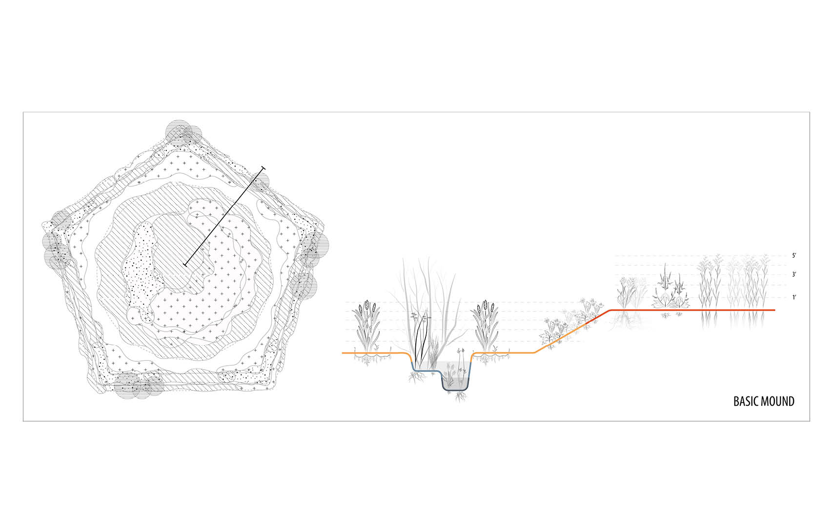 Micro-landforms constructed of on-site dredged material and placed perpendicular to existing drainage pathways are proposed to intercept, slow, and hold rain water in the upper watershed of HMI, functionally decreasing the operational footprint of the facility, while simultaneously creating moisture gradients that can support a diverse range of plant, animals, and recreational opportunities. In this new landscape, ecological succession is augmented by adaptive management to ensure that both public access and environmental benefits are maintained. These designs for HMI were developed as part of the Maryland Port Administration’s collaborative Design with Dredge program.