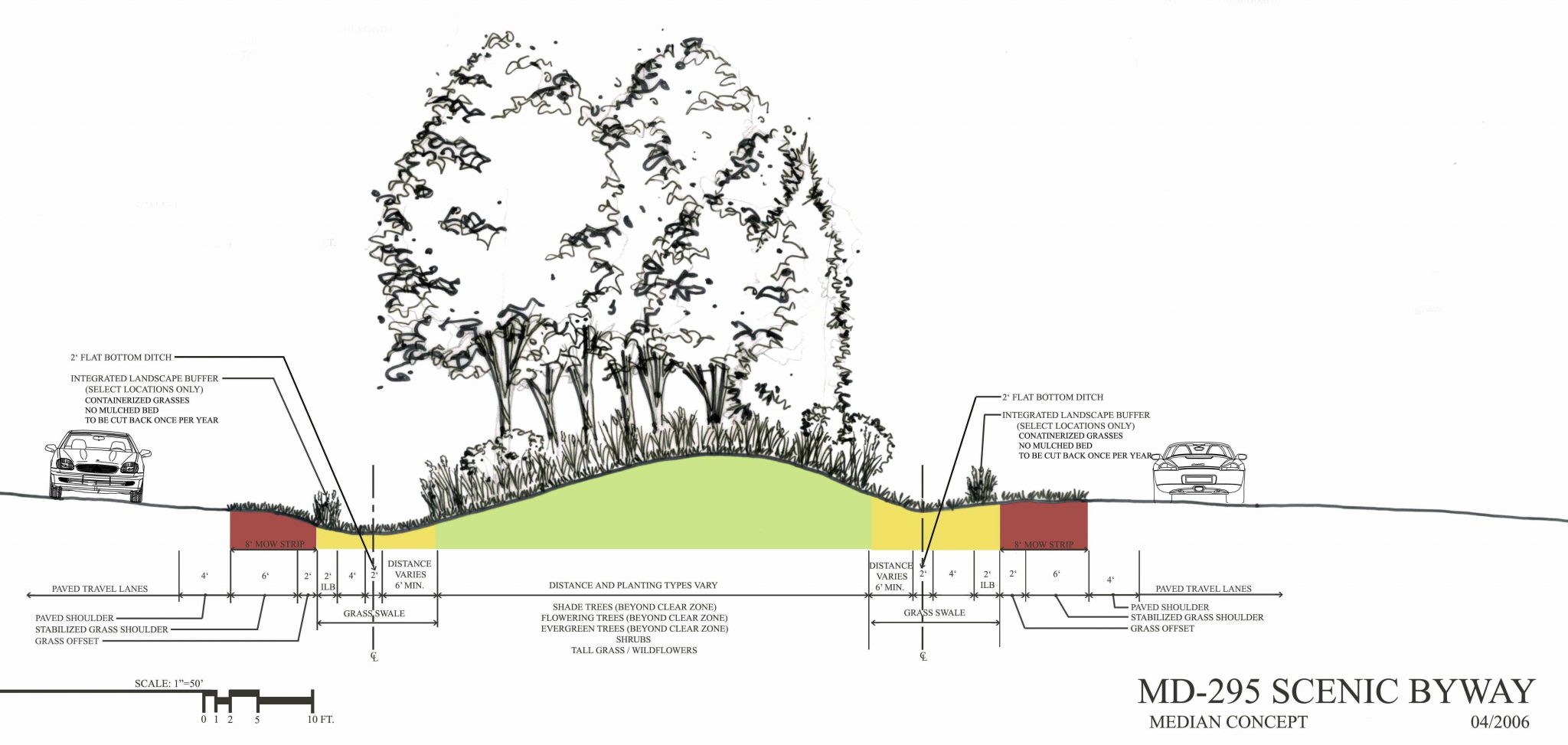 The function of a highway corridor is less personal than a Main Street and shared on a much greater scale, either routinely by commuters, or by traveling motorist just driving through without ever stopping. Plantings need to be designed in bolder and longer masses so that they are not overlooked; Plantings define corridor edges and speak/react to the environment; bridges become gateways; and culverts become wildlife passage.