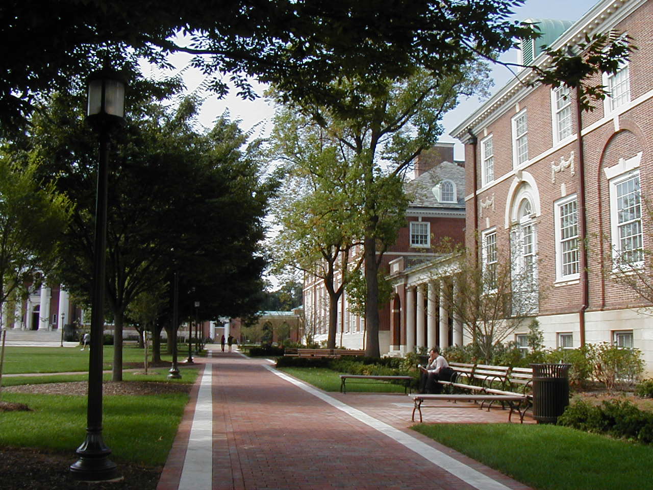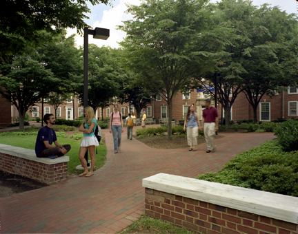Brick and marble paving materials coordinate with the facade of adjacent buildings, and pathways were oriented to maximize efficient circulation and available green space. Lighting, seating, and other site amenities were also improved throughout the campus. Security issues have been addressed by means of planting, rather than fencing, wherever possible. Several distinct and identifiable open spaces, or quads, were defined as part of the plan. These provided opportunities for relaxation and recreation while preserving the traditional character of the campus.