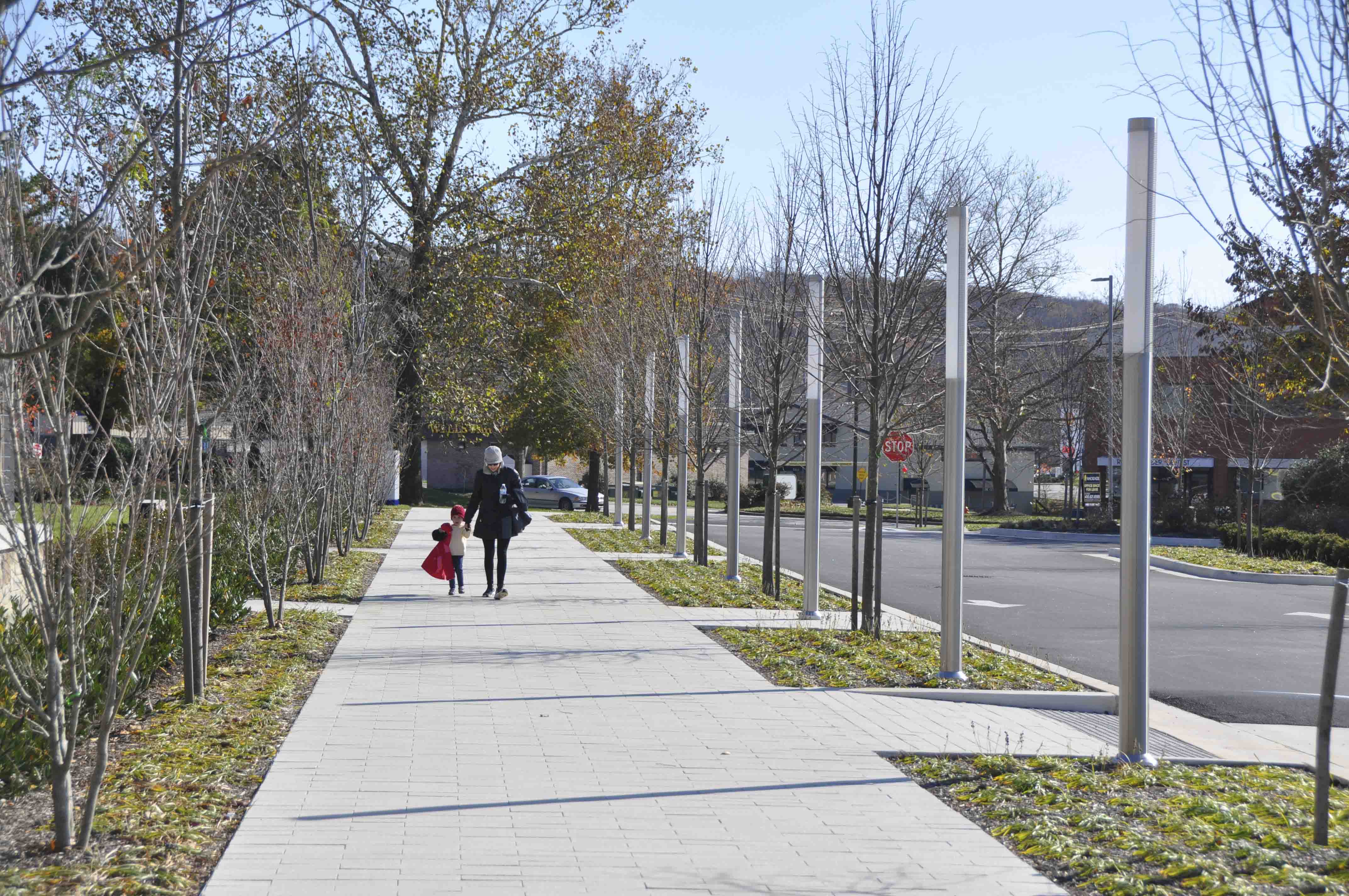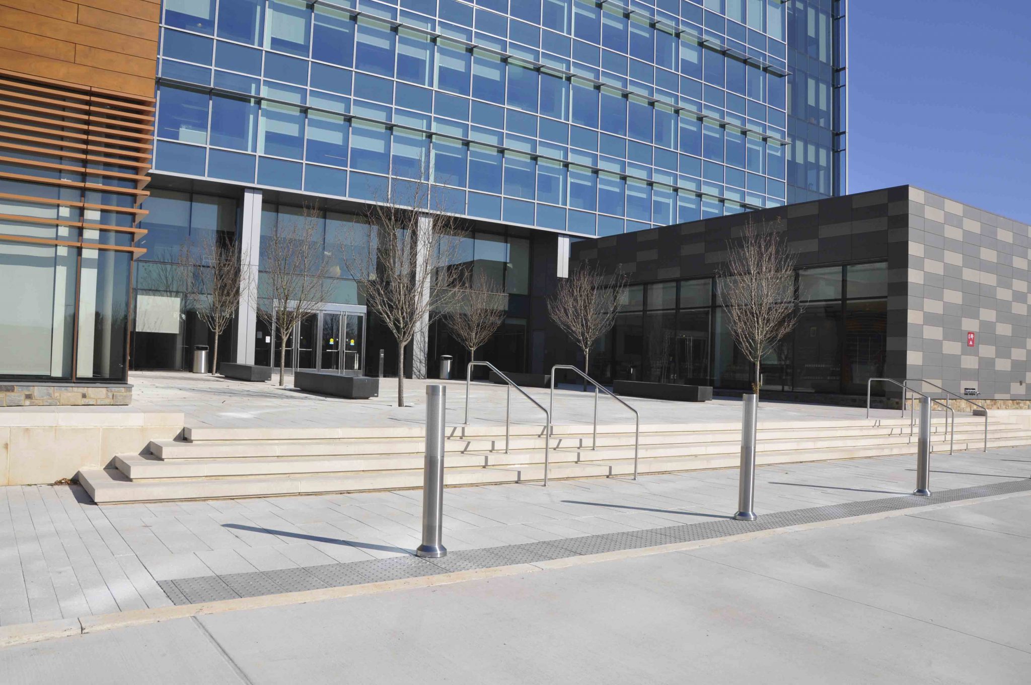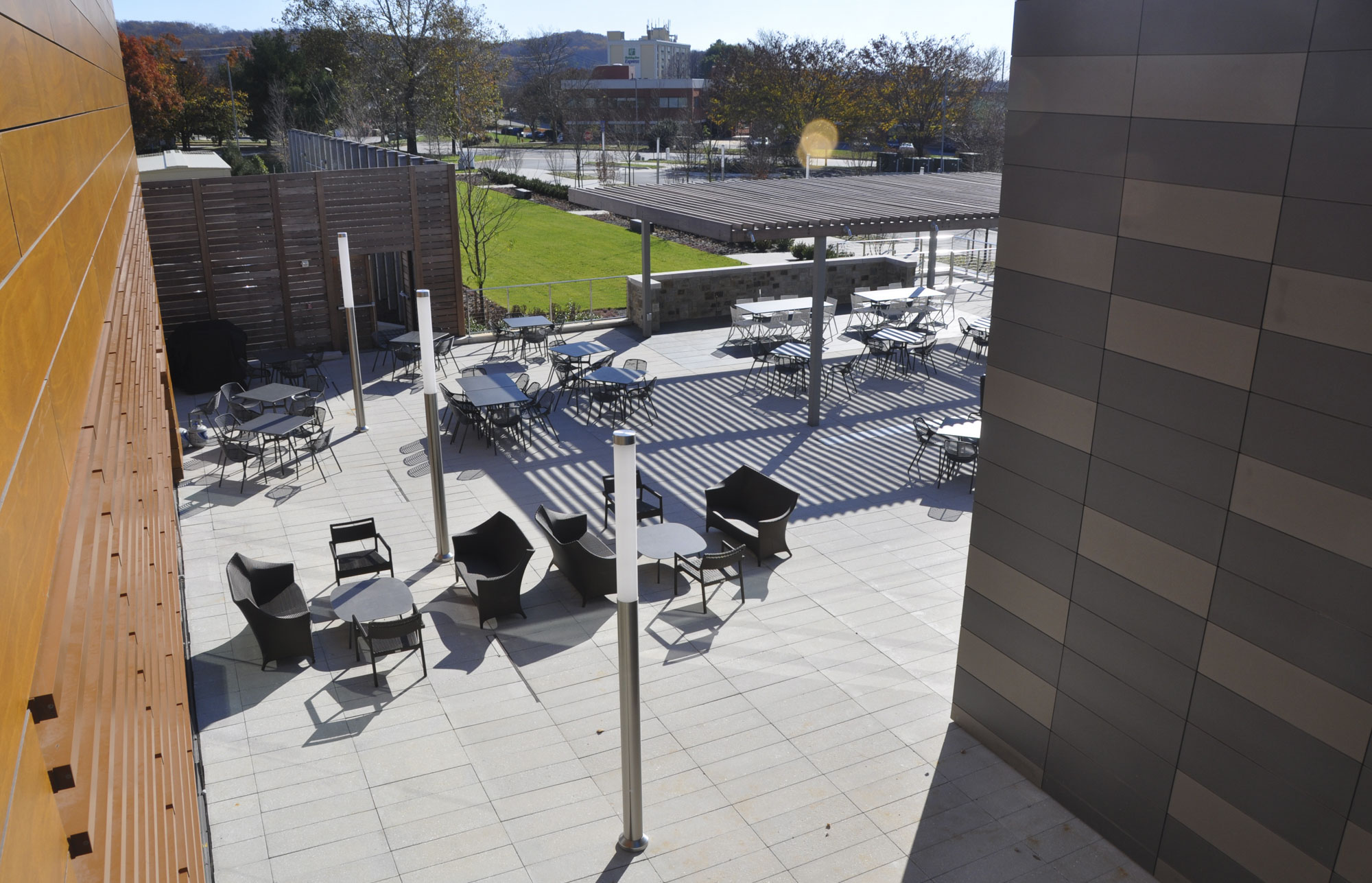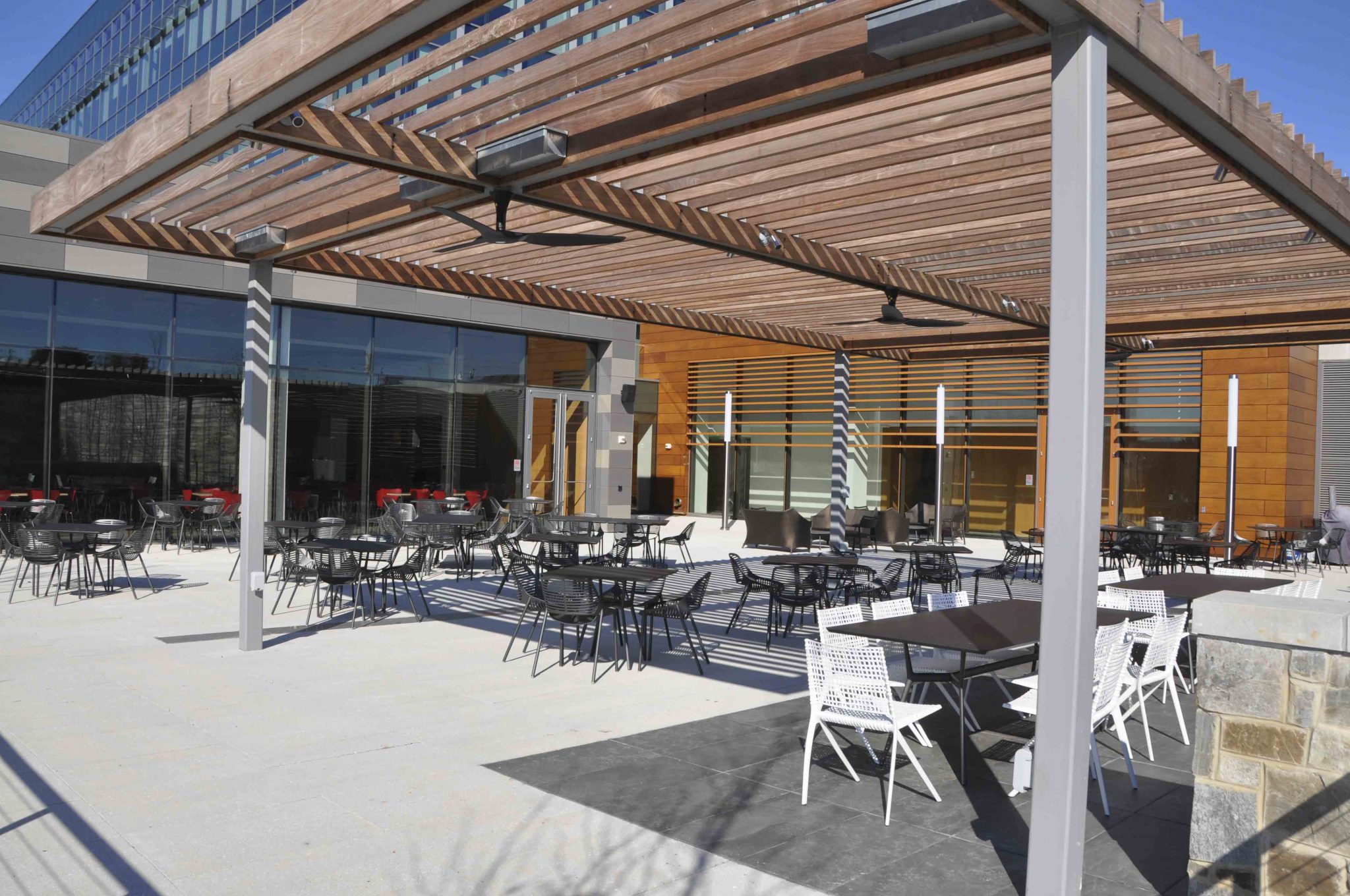 Hardscape improvements include: simplified pedestrian walkways through the parking fields; a main arrival drop off plaza flanked by two new building additions; and an exterior eating terrace will be enclosed and include outdoor grilling and seating arrangements for flexibility of the staff meeting and socializing opportunities. Lastly, two exterior garden spaces and a perimeter walkway/exercise loop will provide staff opportunities to utilize and experience the exterior of space through sensory inspired plant materials.