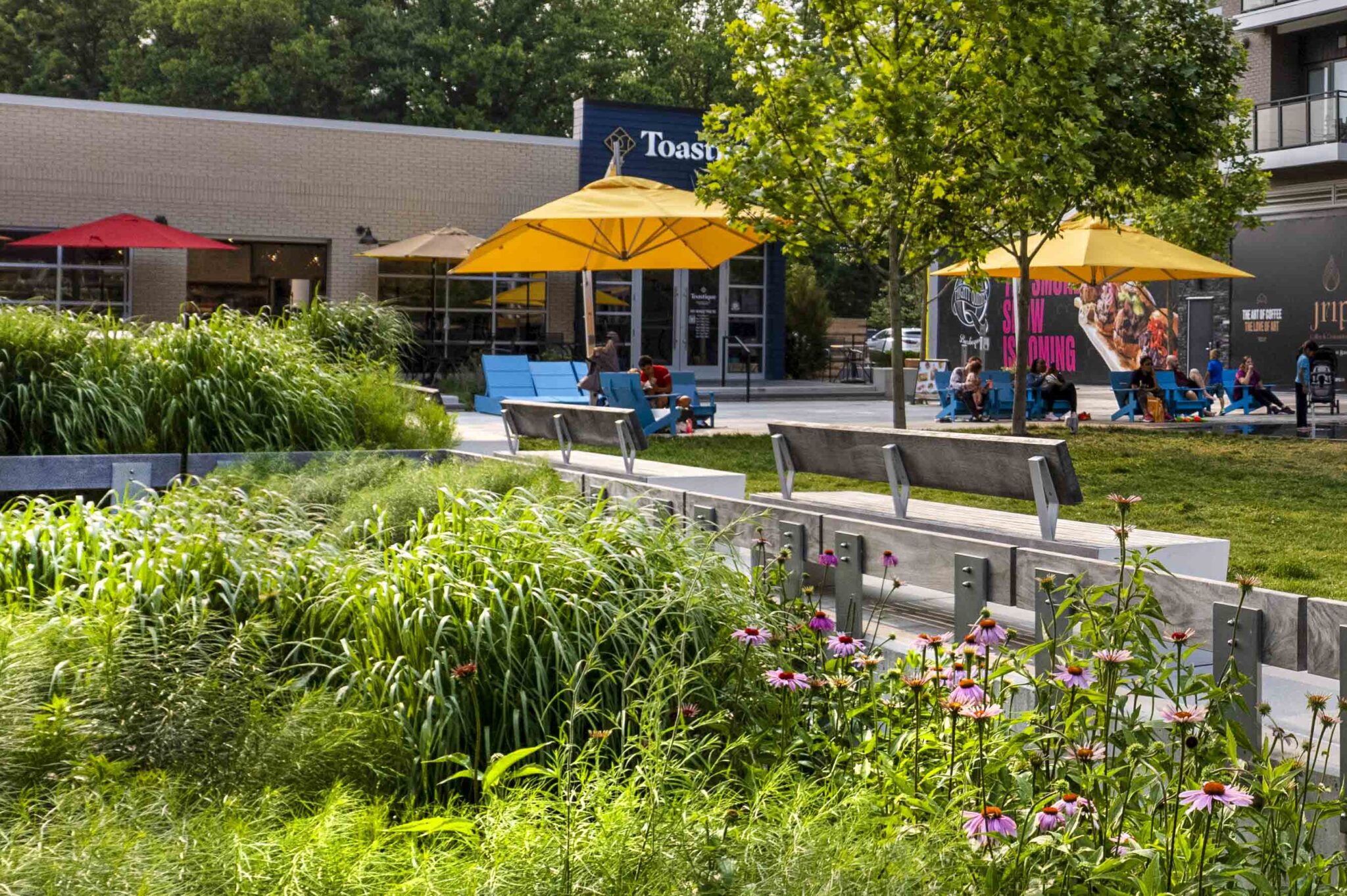 The streetscape of Color Burst Park offers three distinctive zones with a Bio-Retention zone along the road, a pedestrian and cyclist zone in the middle, and a transitional zone along the building edges. These corridors allow people to move through the Park comfortably in different ways throughout the year.