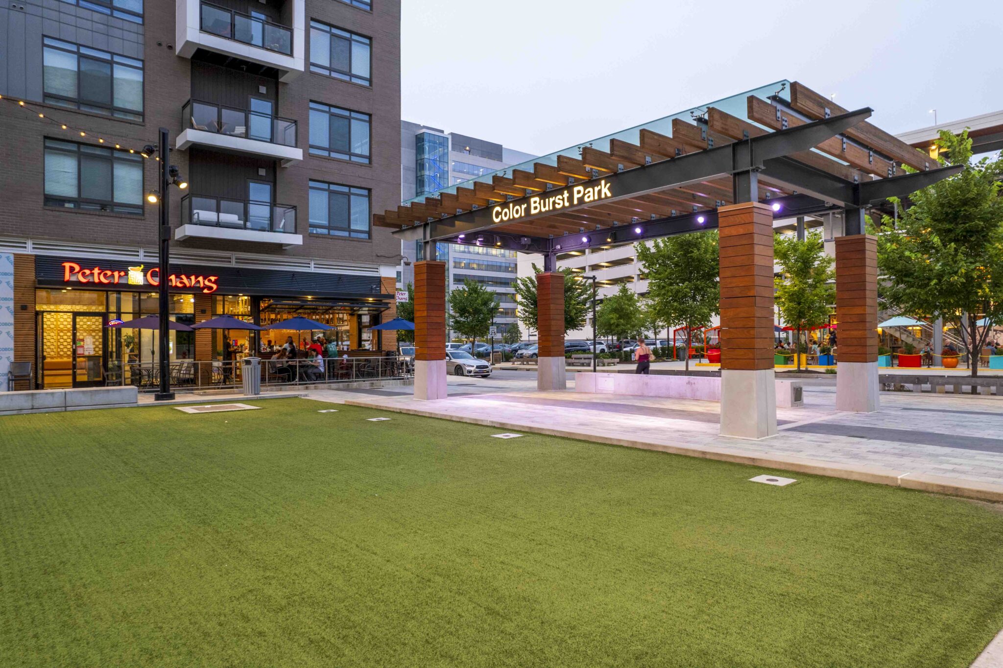 Located in downtown Columbia, Maryland, within the Merriweather District’s mixed-use area, Color Burst Park is designed to foster community interaction and creativity through its versatile public spaces. The park features five main areas: a promenade, a shared street, an event pavilion, an open lawn, and a fountain plaza, each serving multiple functions throughout the year to accommodate pedestrians, vehicles, and various events.