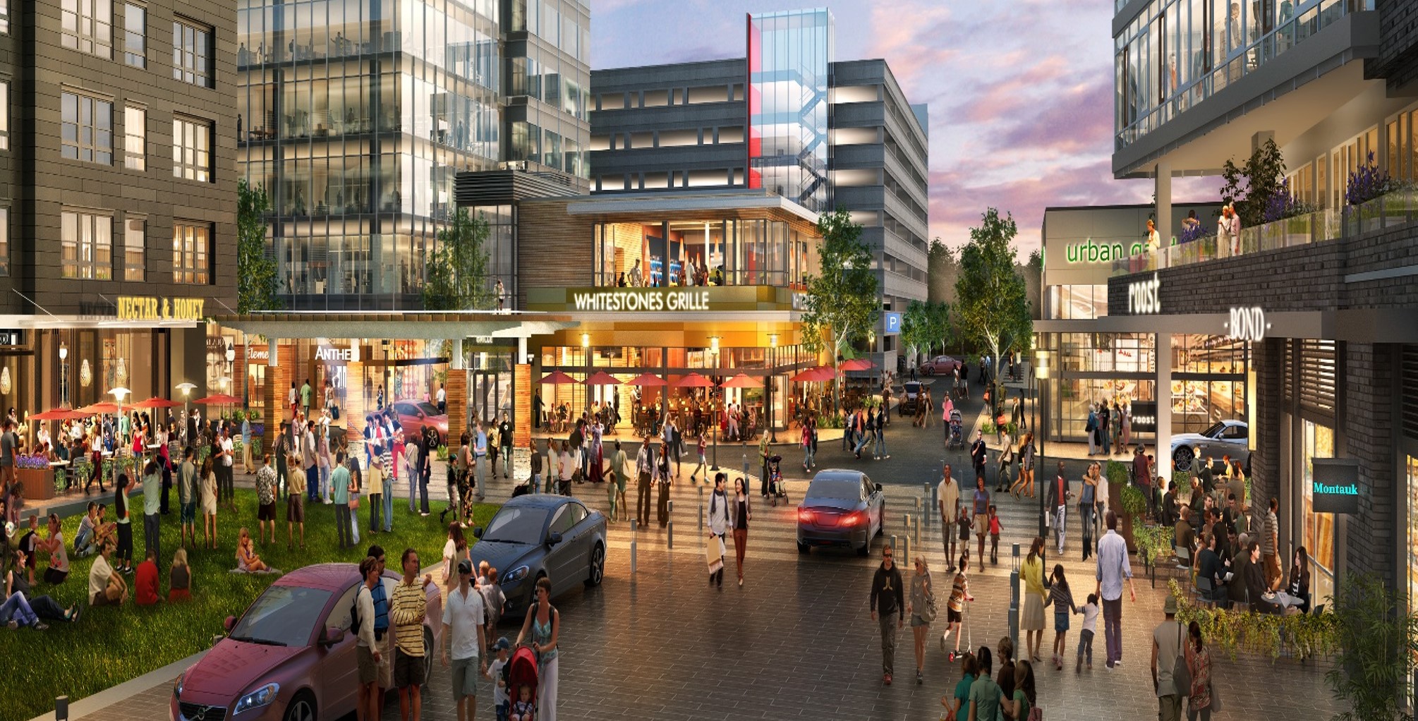 Key attractions include the promenade that connects to a future trail system and anchors to a restaurant, encouraging window shopping and outdoor dining. The shared street caters to both routine and seasonal uses like a holiday market. The event pavilion is a dynamic space hosting concerts in summer and serving as a skate rental hub in winter. The open lawn transforms seasonally into a venue for yoga, theater, markets, and an ice rink, while the fountain plaza offers a cool retreat in summer and a lit-up plaza in winter.