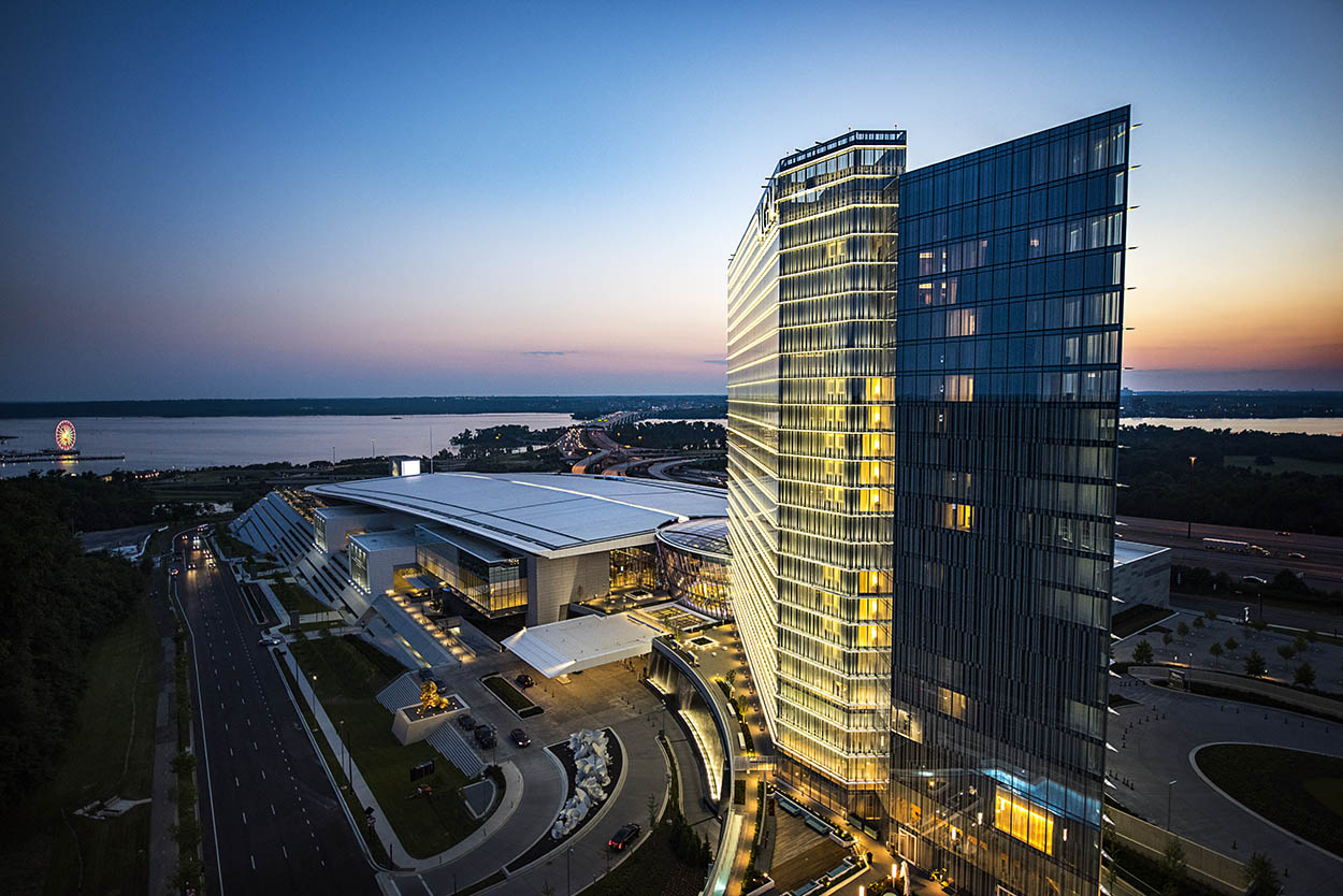 The resort was designed to reflect the same level of quality and sophistication as other iconic MGM hotels while respecting the geography and history of the area. Monumental, serene and rich in material selection, a broad range of visitors are attracted to the humanscale comfort and intimacy juxtaposed to a monumental interactive fountain, LED screens, and performance and gathering spaces—with inspiring views of National Harbor and the Potomac River.