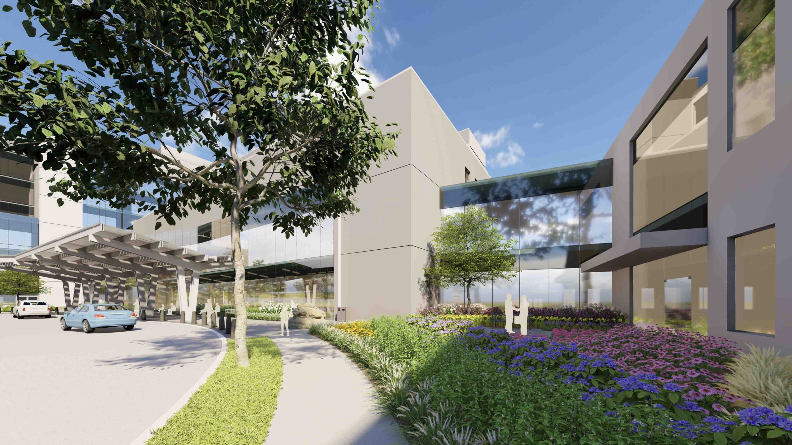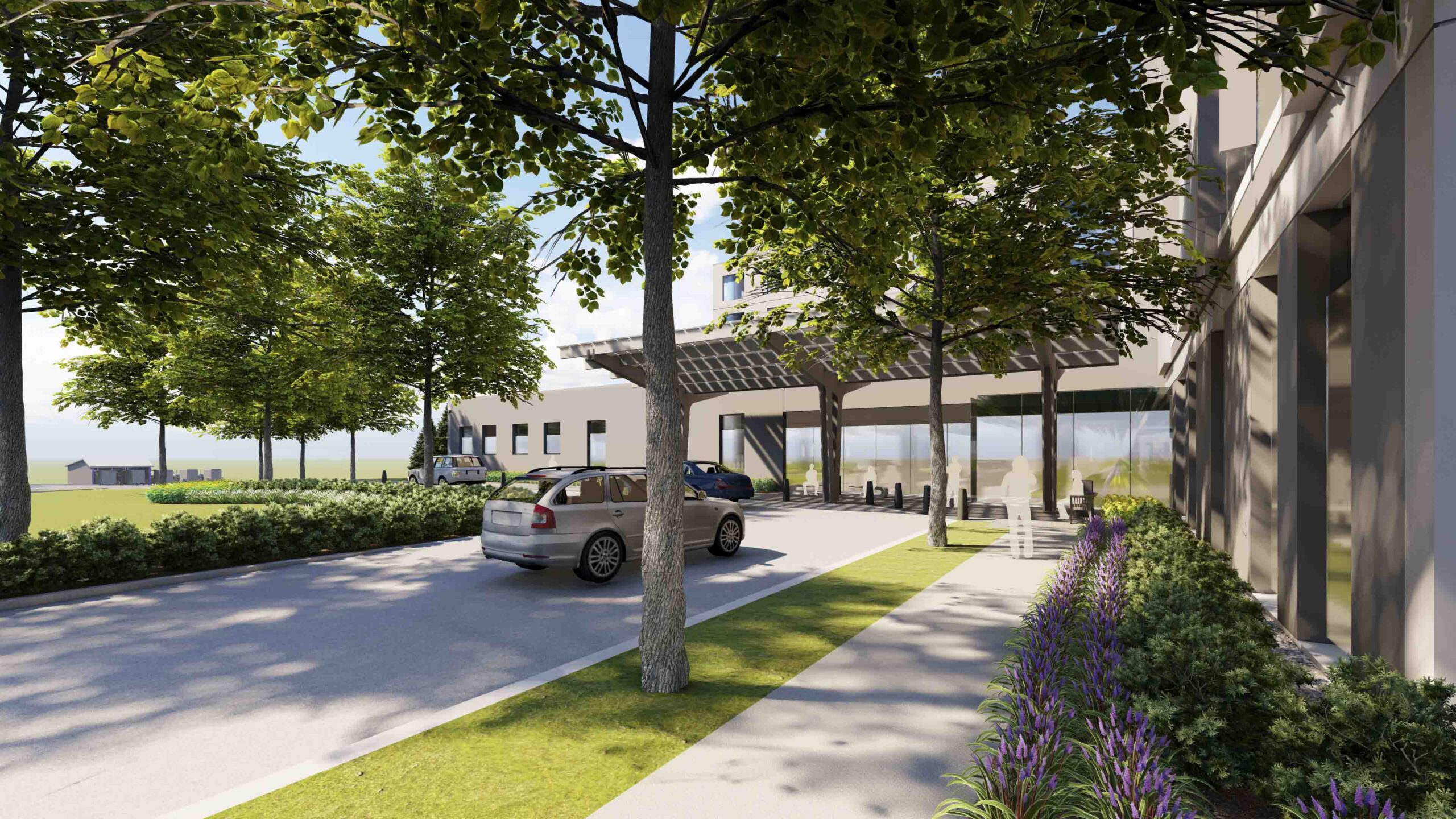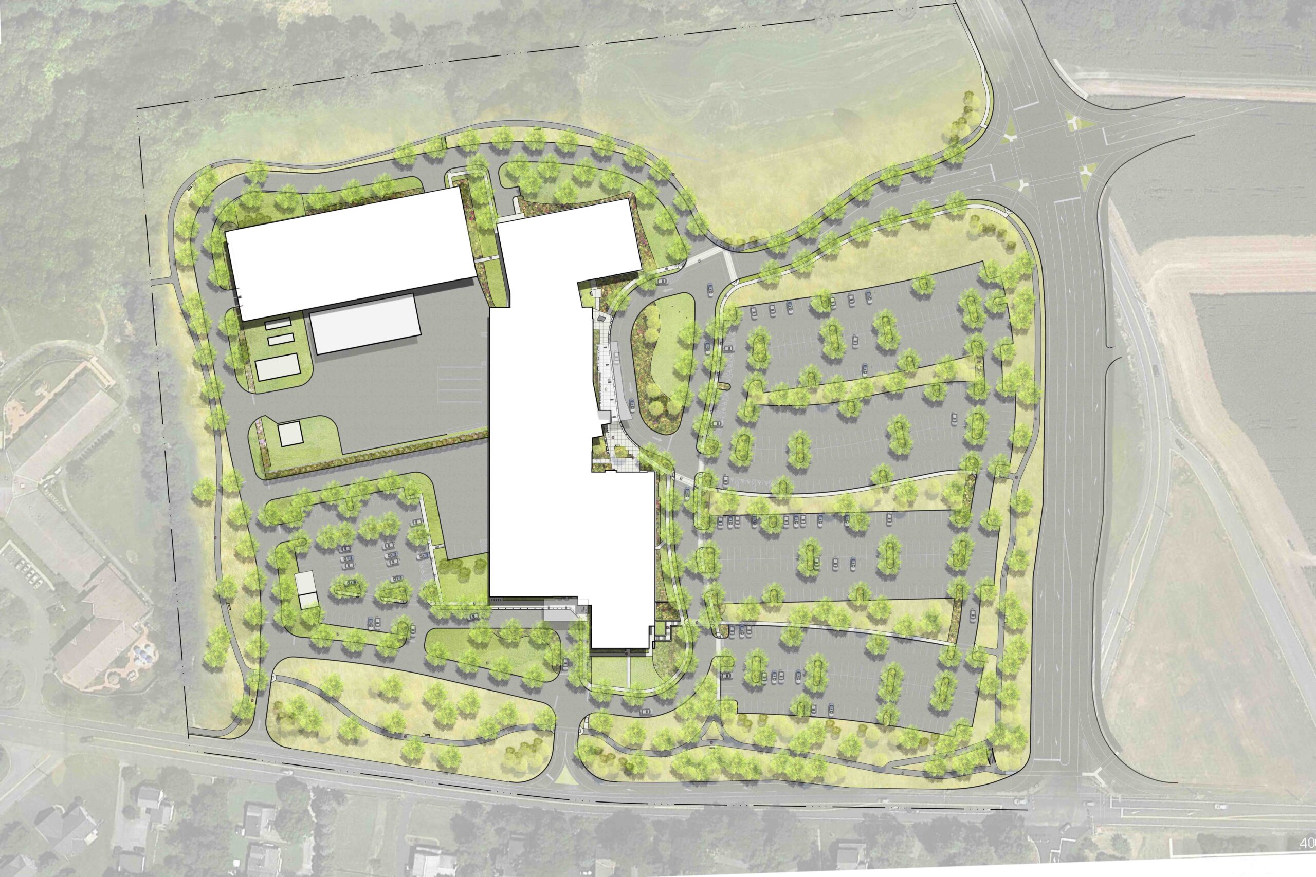 The landscape and site development of the Penn State Health—Lancaster campus seamlessly blends architecture and landscape to create a cohesive design with the vernacular architecture and landscape of the site and local area. Walking trails are an important feature of the campus’ overall health goals; encouraging visitors to experience the relaxation derived from time spent in the landscape as well as the healing benefits found through passive interaction with the sites existing features. Storm water management will be purposively integrated within the landscape and hardscape, incorporating strategies which make the most effective use of site facilities and serve as an attractive example of sustainability and innovation in environmental site design. These will act as attractive landscape features as well as provide natural irrigation and innovative storm water management opportunities. These features may also include interpretive signage or other opportunities for patient and staff interaction with the environment.