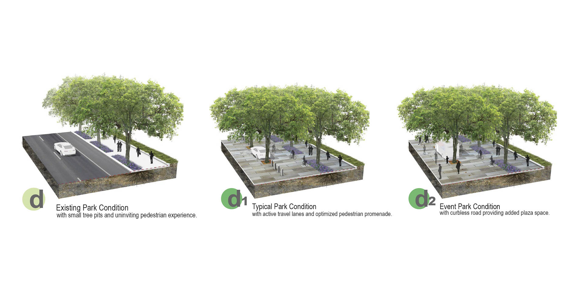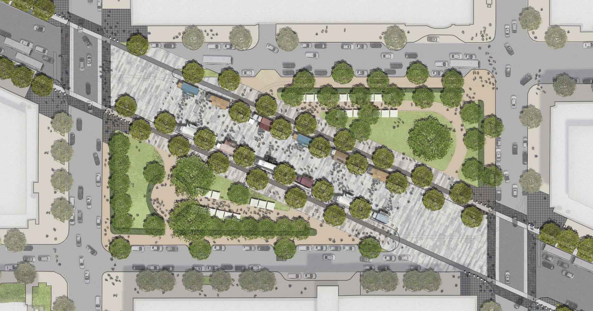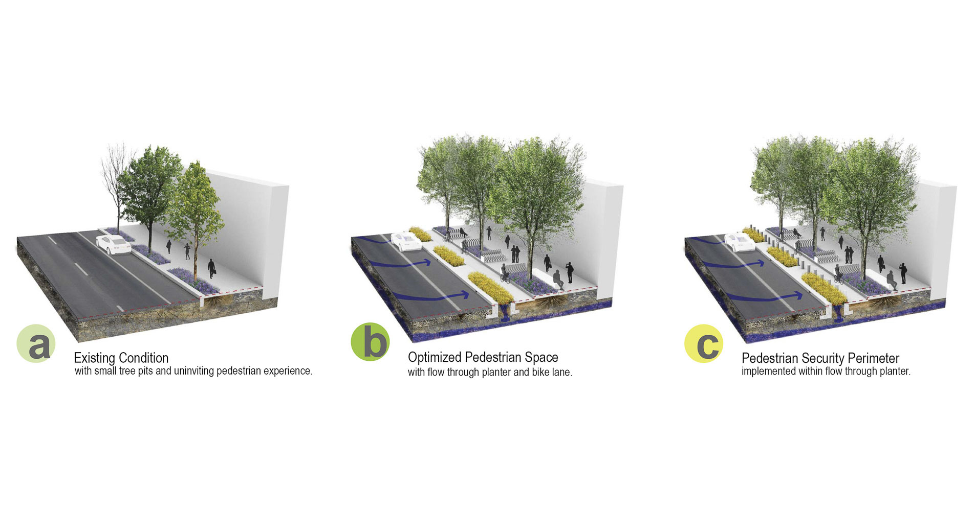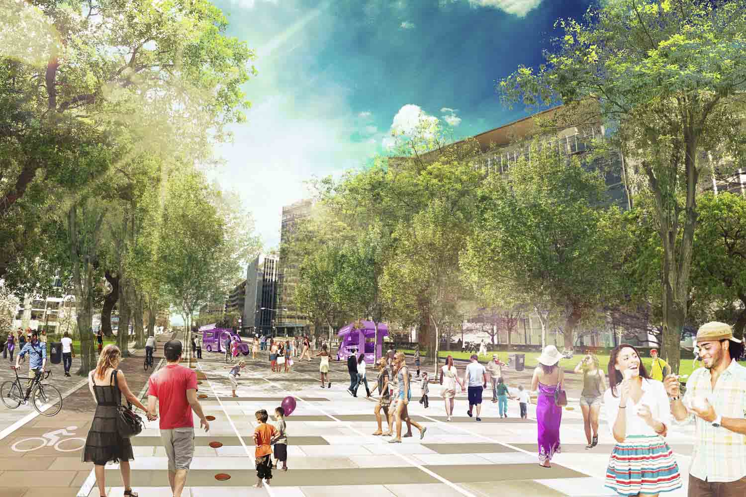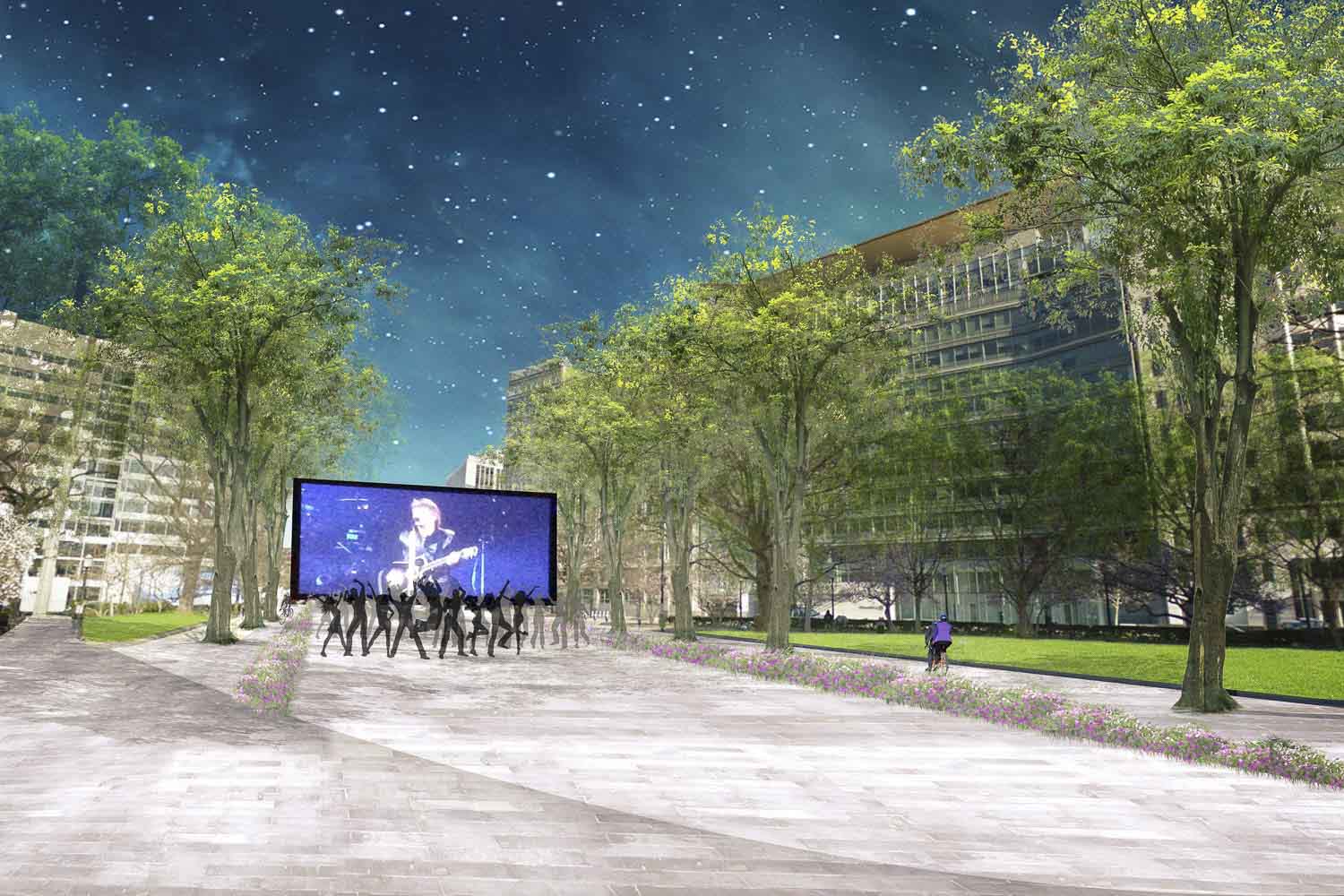 The Mahan Rykiel team is proposing a design approach that is both figurative and formal. Power serves as a conceptual bridge to frame and structure the narrative of Pennsylvania Avenue west of the White House as distinct from, as well as, a foil to Pennsylvania Avenue east of the White House. Physically, an updated infrastructure of power articulated along a renewed streetscape will serve to unify the public realm and create a cohesive experience for pedestrians, cyclists, and motorists in the form of enhanced bike lanes, stormwater management features, and alternative energy elements (photovoltaic charging stations, LED lights, piezoelectric surfaces, etc.). This expression of power will be amplified in the public right of way alongside Murrow and Monroe parks with flush curbs, special paving, and planting details in order to facilitate the large gatherings and events that are quintessential to the energy of the nation’s capital.
