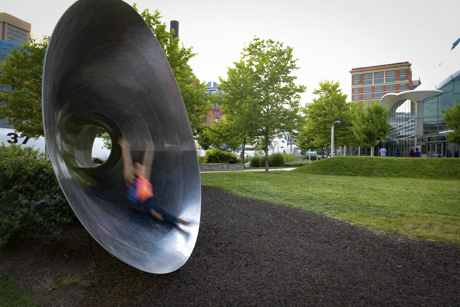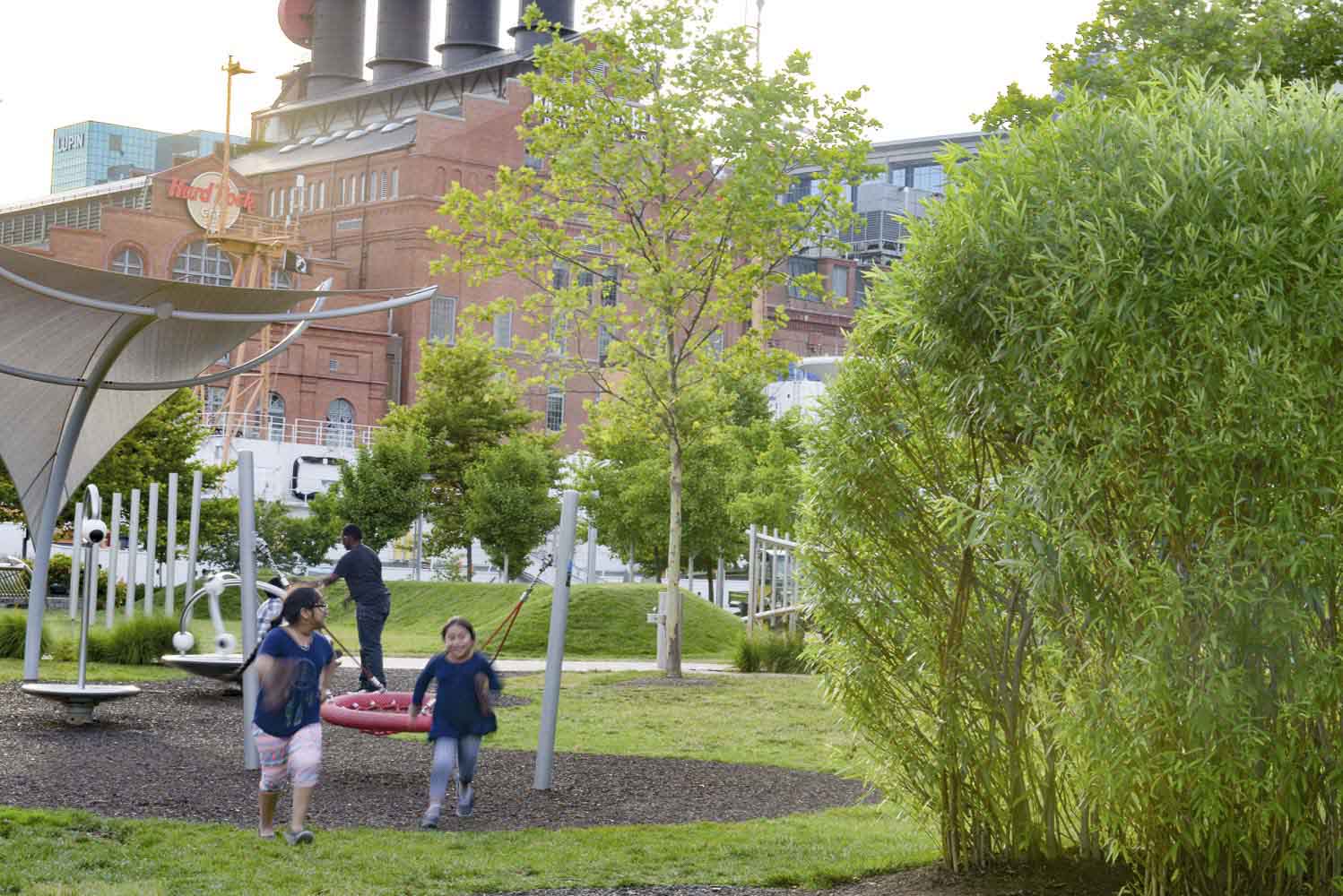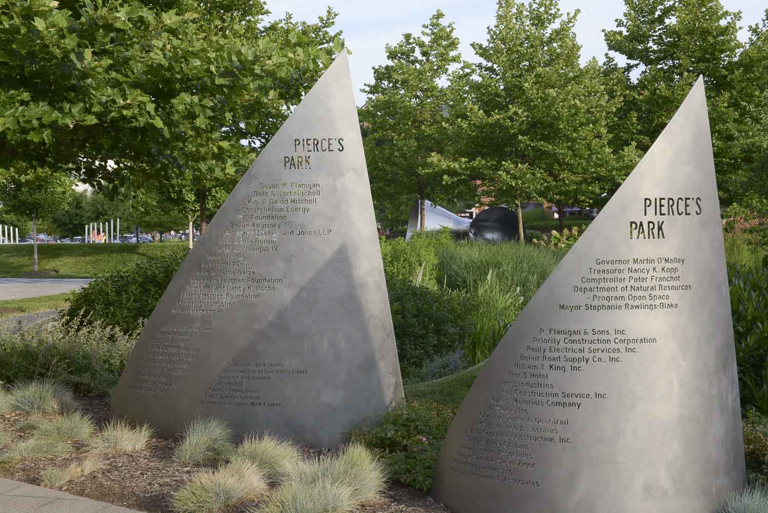 Inspired by his life and legacy, the family of Pierce Flanagan III sponsored the creation of a downtown park that bears his name. Selected by the family to design this park, Mahan Rykiel has created a unique open space that will engage children and families as part of the Inner Harbor landscape. The site is loosely designed as two open spaces connected by a “Ribbon Walk”. One area attracts older children to an unstructured play area which includes landscaped berms, an open green, and custom sculpture. The other area is designed for younger children and contains a living ‘willow tunnel’, two sculptures and a fence that produces musical sounds when tapped. Homophonic words are inscribed along the serpentine walk for children to discover.