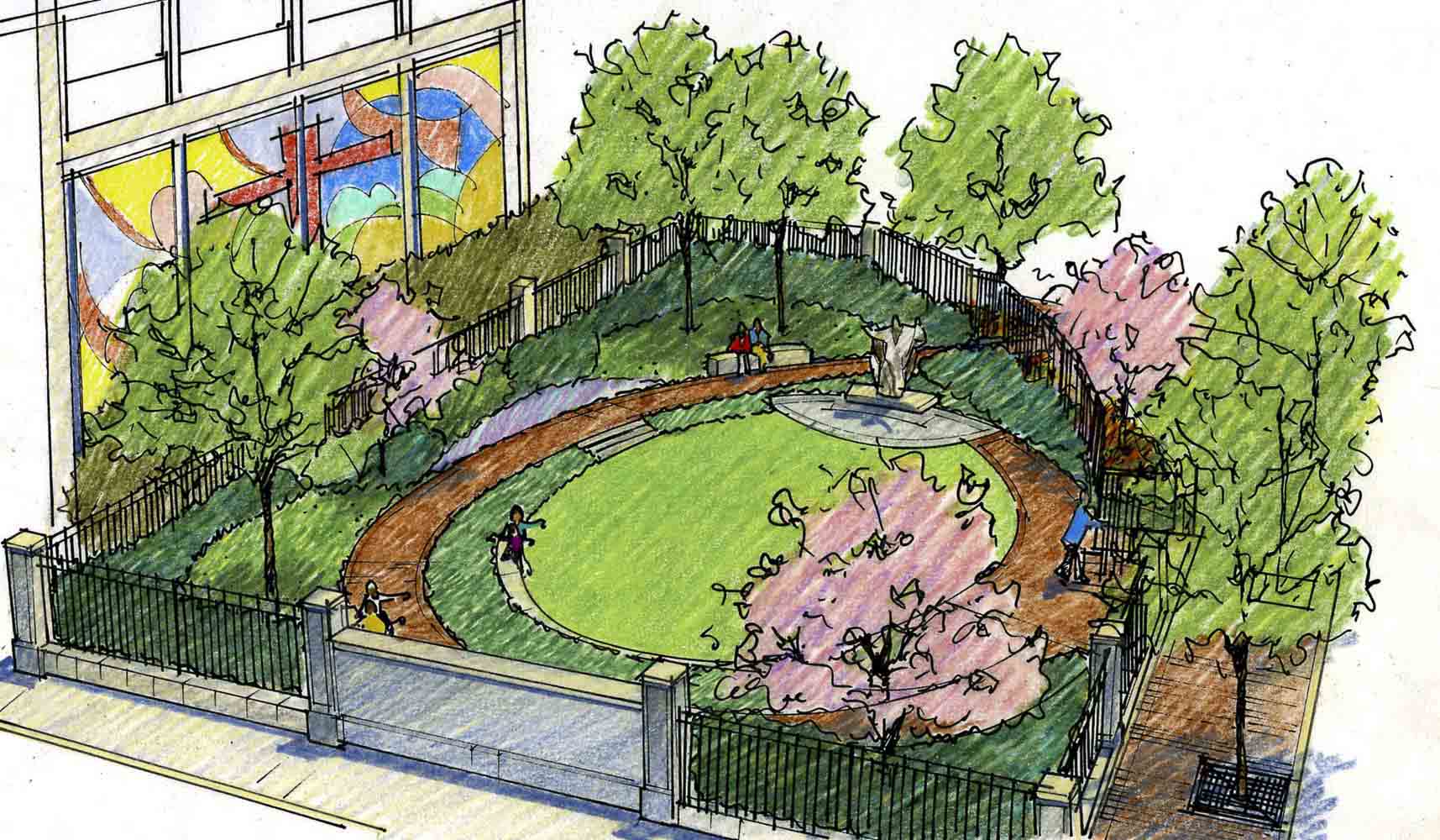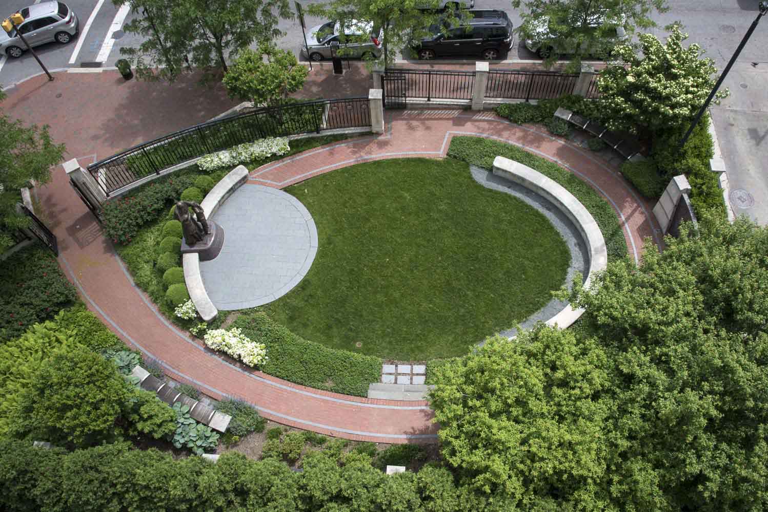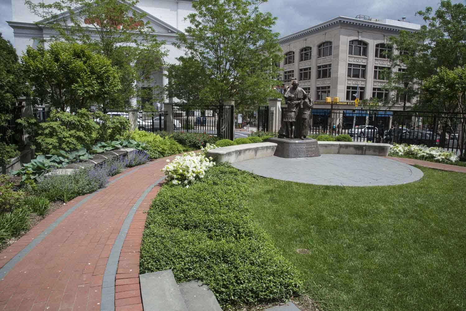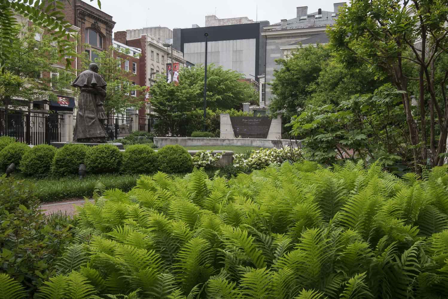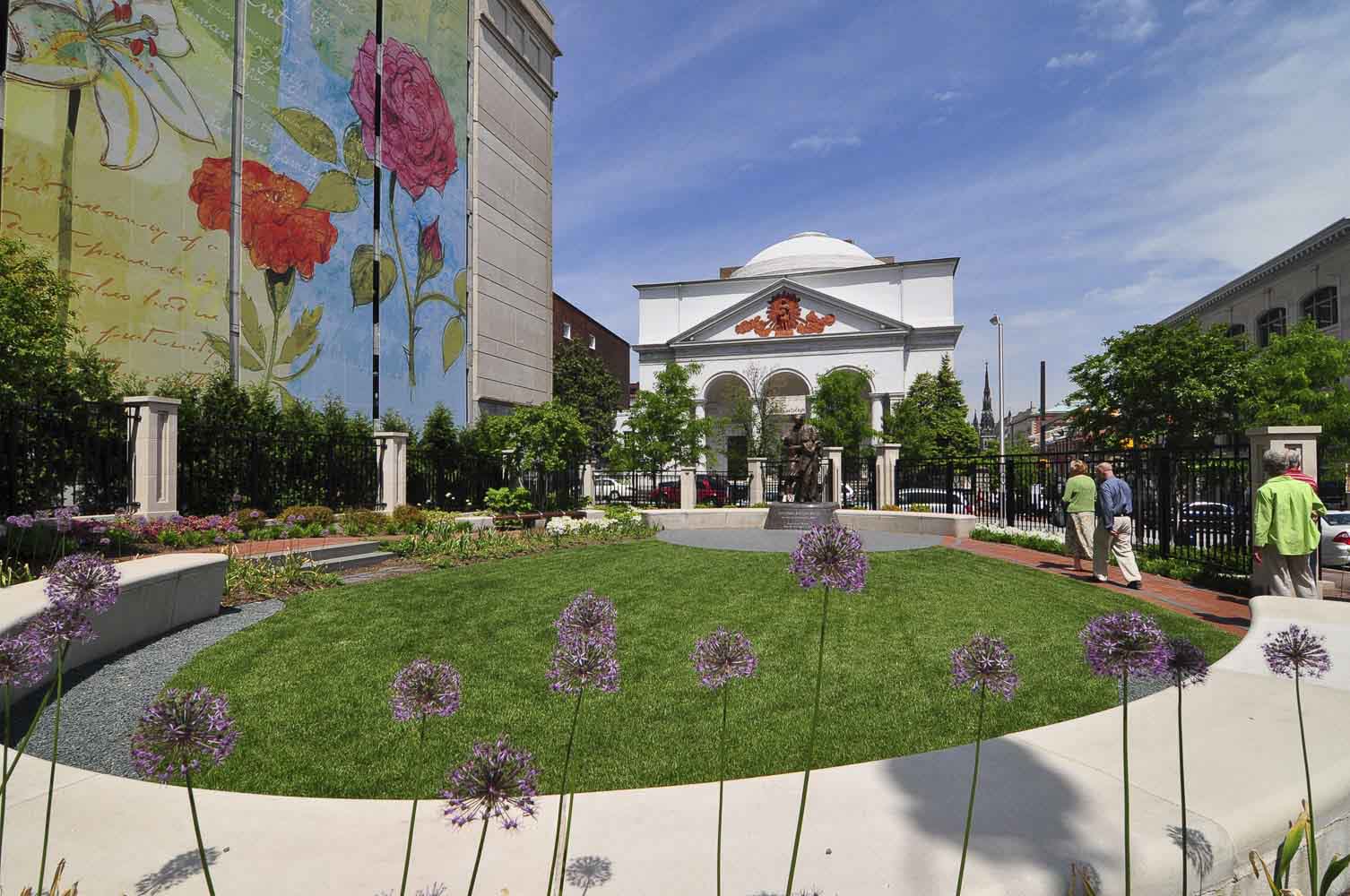 When Pope John Paul II visited Baltimore in 1995, he carried a message of hope and understanding, concern for the poor and respect for religious freedom. The new Pope John Paul II memorial prayer garden embodies these same ideals, inviting people to contemplate the themes of the late pontiff in a setting archdiocesan leaders described as a “bold” spiritual oasis. Working closely with the Archdiocese, Mahan Rykiel designed an 8,000 square foot garden with a circular form which is embracing and inclusive central themes to the Pope’s legacy. A larger than life statue of Pope John Paul II is the focal point of the garden on a marble pedestal.