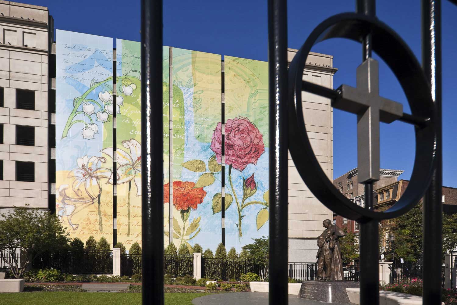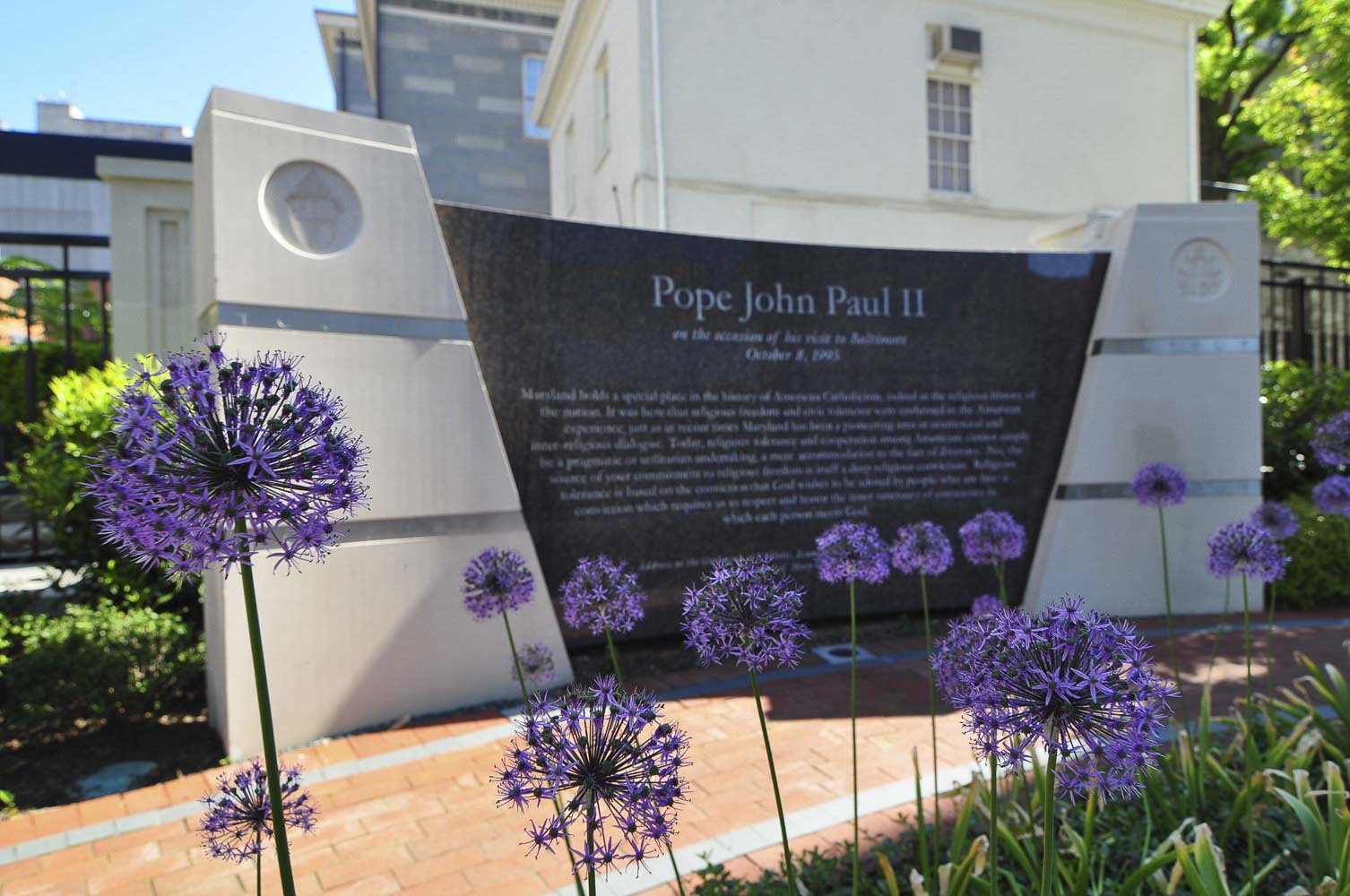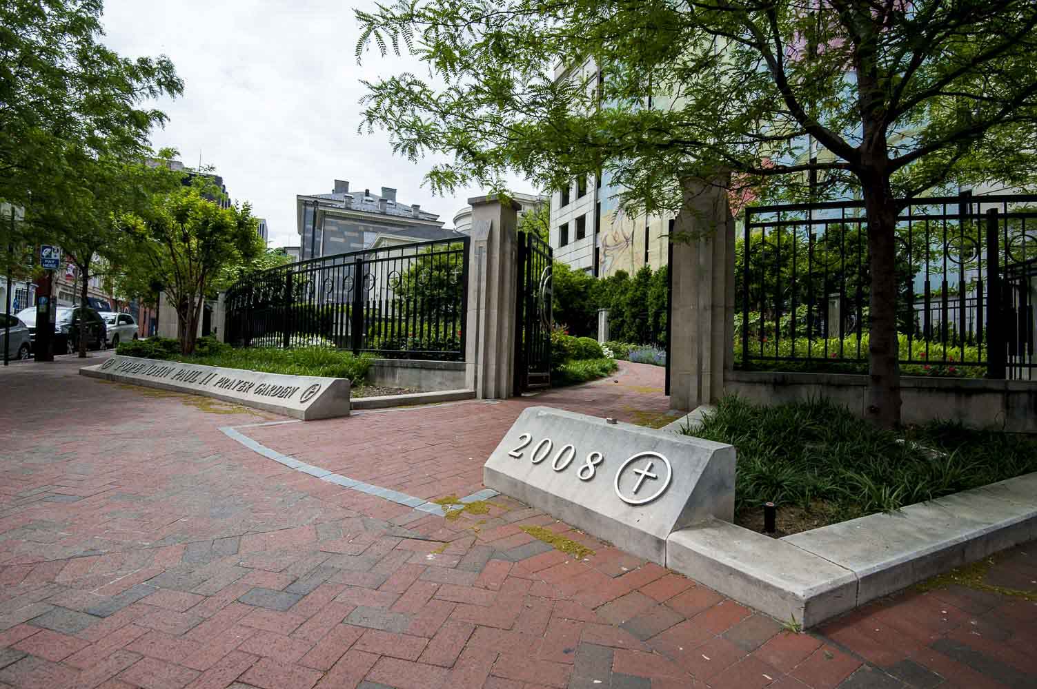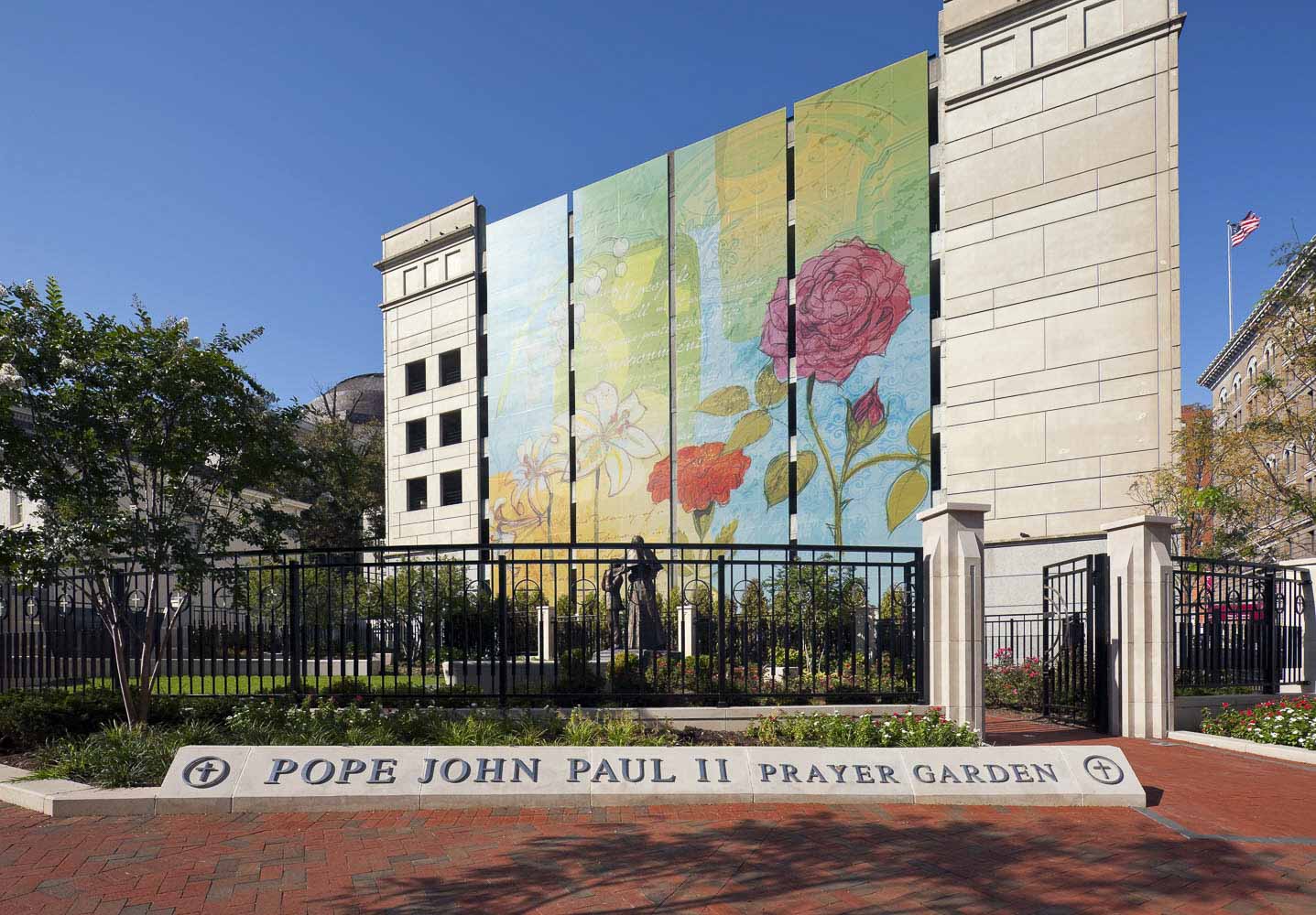 Pathways guide visitors through the garden, along a high wall which bears inscriptions of quotes from Pope John Paul II and some of his prayers. Other elements include markers highlighting both religious freedom and the history of the Catholic Church in the United States.