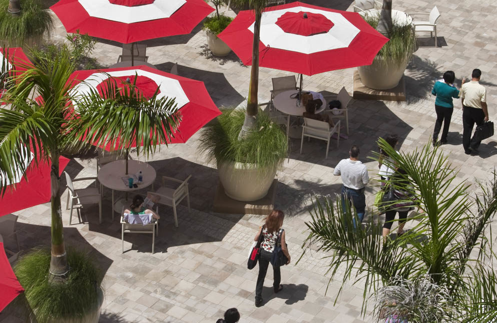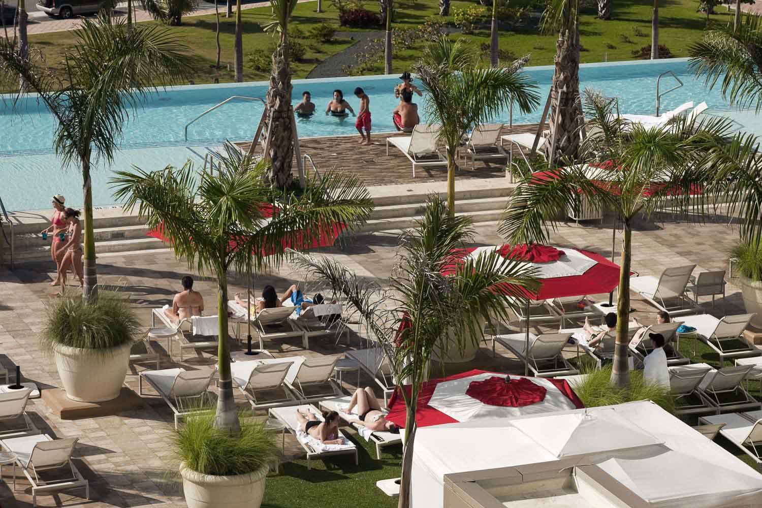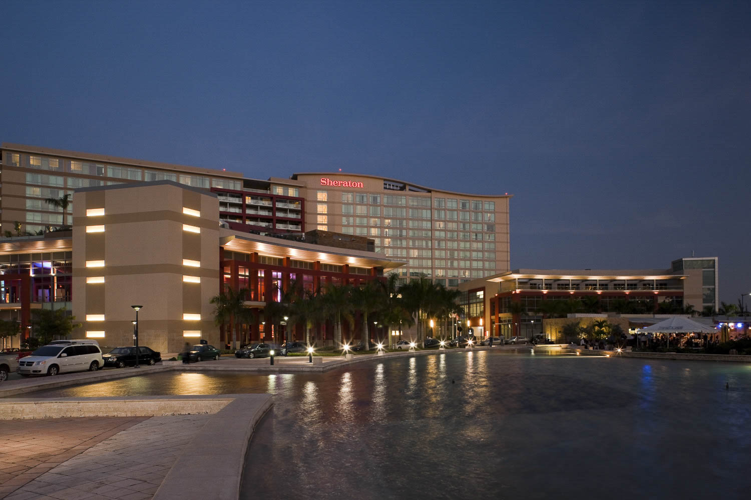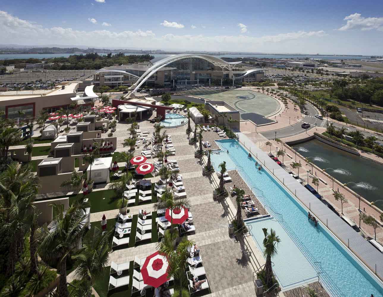 At almost two acres, the pool deck at the Sheraton Convention Center Hotel provides a multi-faceted amenity and activity center that overlooks the harbor and City of Old San Juan. A 50-meter infinity pool is the centerpiece of the palm studded deck that includes a children’s “fun fountain”, a spa and an adult “social” pool adjacent to the bar and grill. An “Events Garden” provides the hotel with a unique profit center both day and night, that can host several hundred people while keeping the bar-grill and main pool deck open for general use.