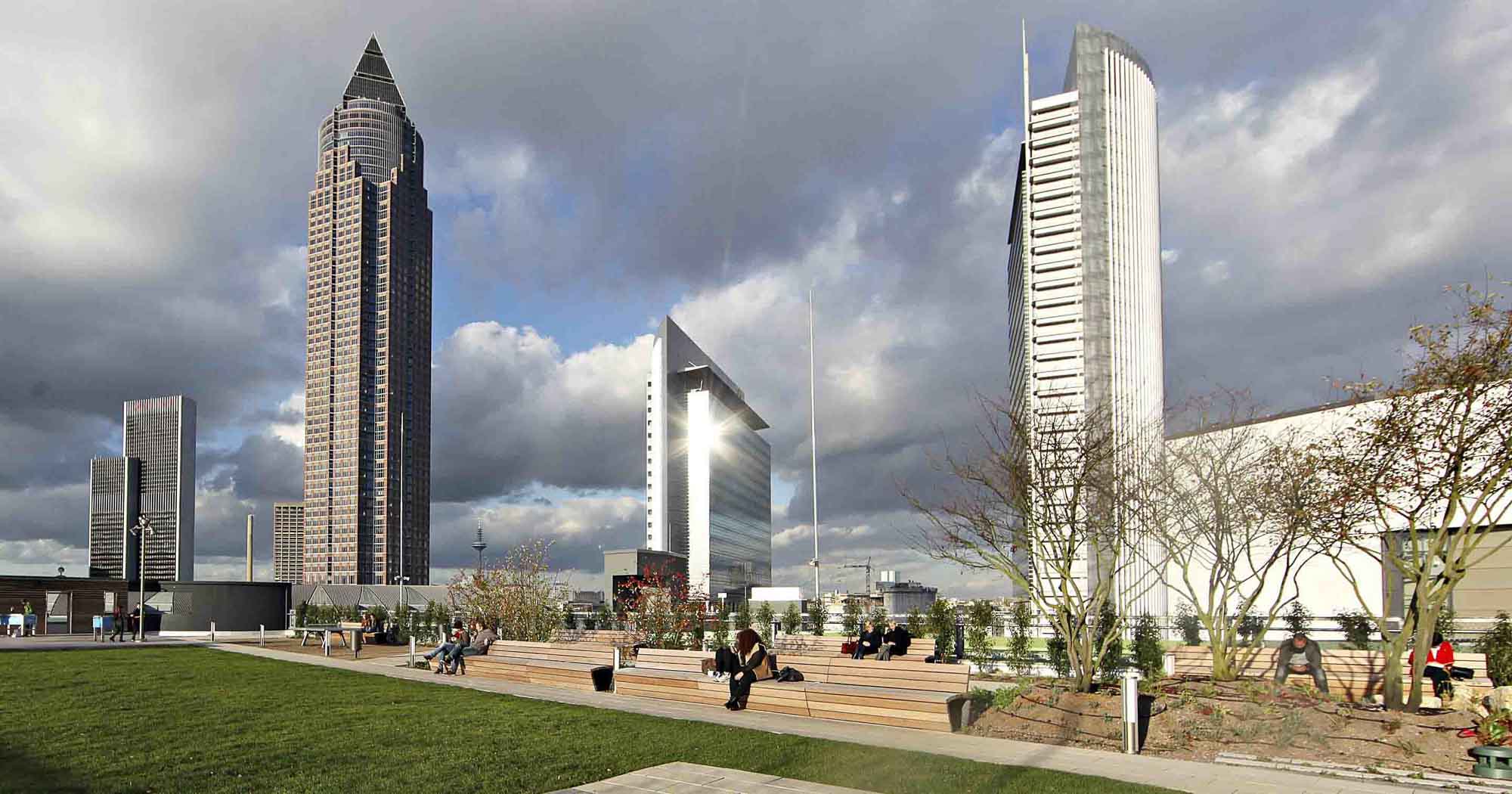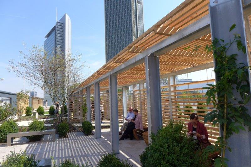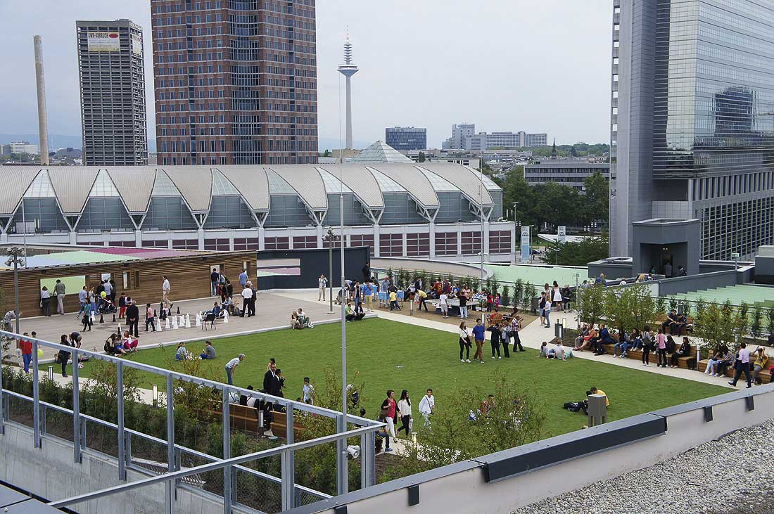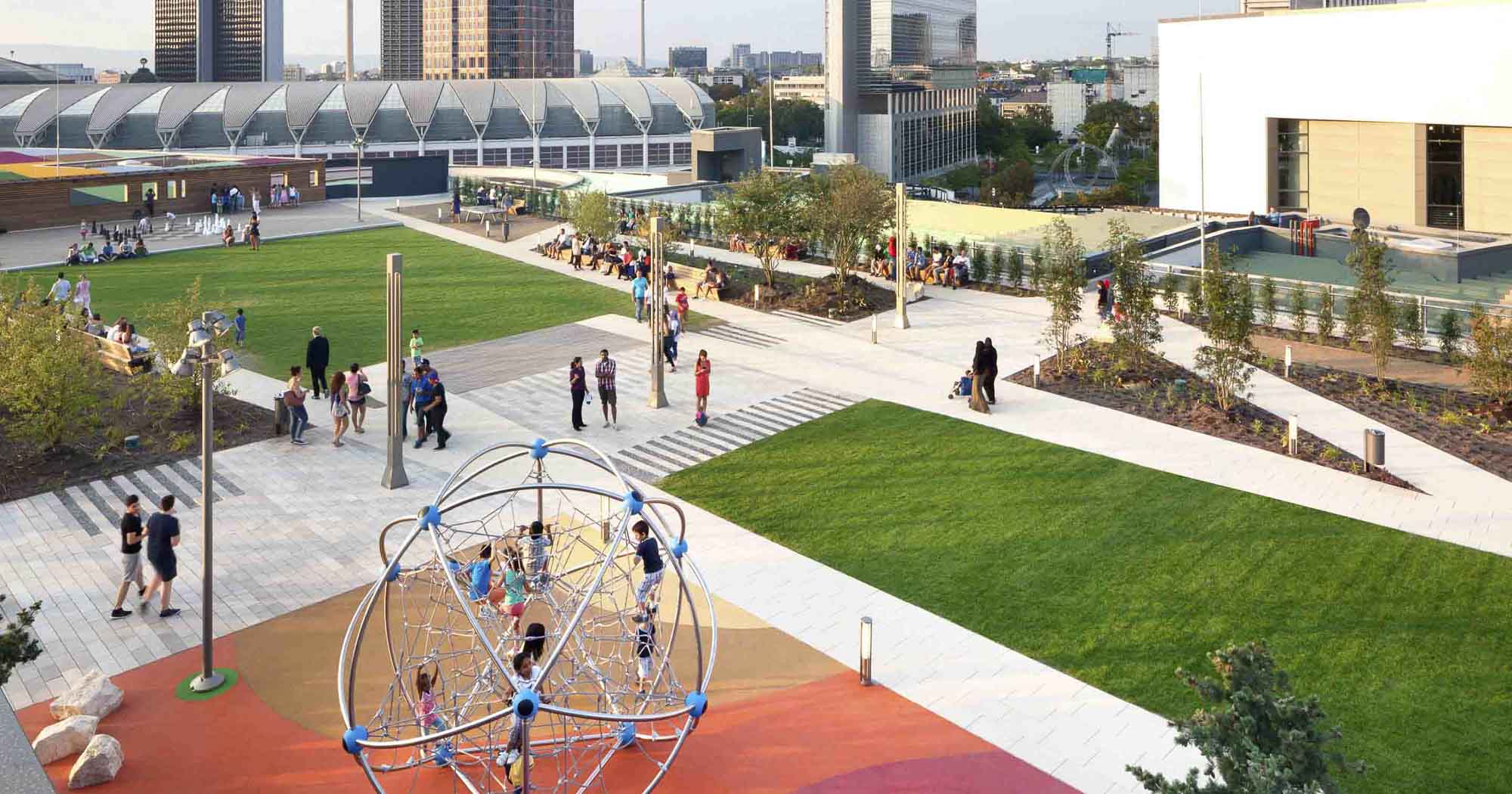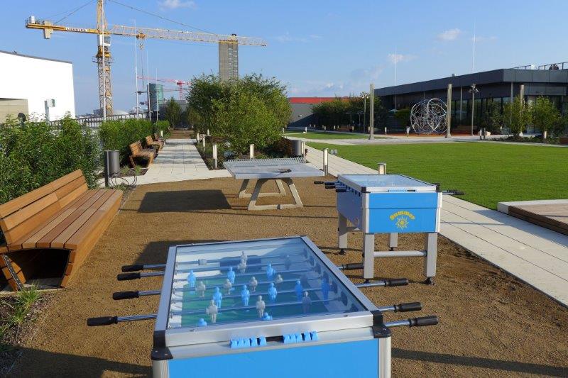 Skyline Plaza is a 409,000 square foot retail center in the heart of Frankfurt’s new convention center district. Skyline Plaza’s rooftop brings a variety of activities to Frankfurt’s newest shopping destination. Mahan Rykiel was hired to assist the Architects with the landscape architecture for the entire roof garden by providing concepts through design development.The rooftop is more than one and half times the size of a football field and offers something for everyone from yoga to playgrounds for the kids, and even a vineyard. There are a wealth of possibilities to discover, including a large chess board, table tennis, foosball, petanque (boules) field, putting green and a performance stage for events. Two restaurants offer unparalleled views of downtown Frankfurt and Europa Boulevard. The concept incorporates a strong axial vocabulary, contrasting the curving, undulating lines of the architecture. A meandering path weaves large spaces for active play with intimate gardens. A broad promenade links the elevator lobby with the restaurant terraces and the play spaces.