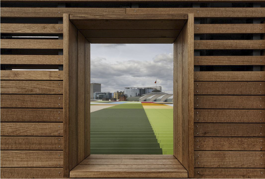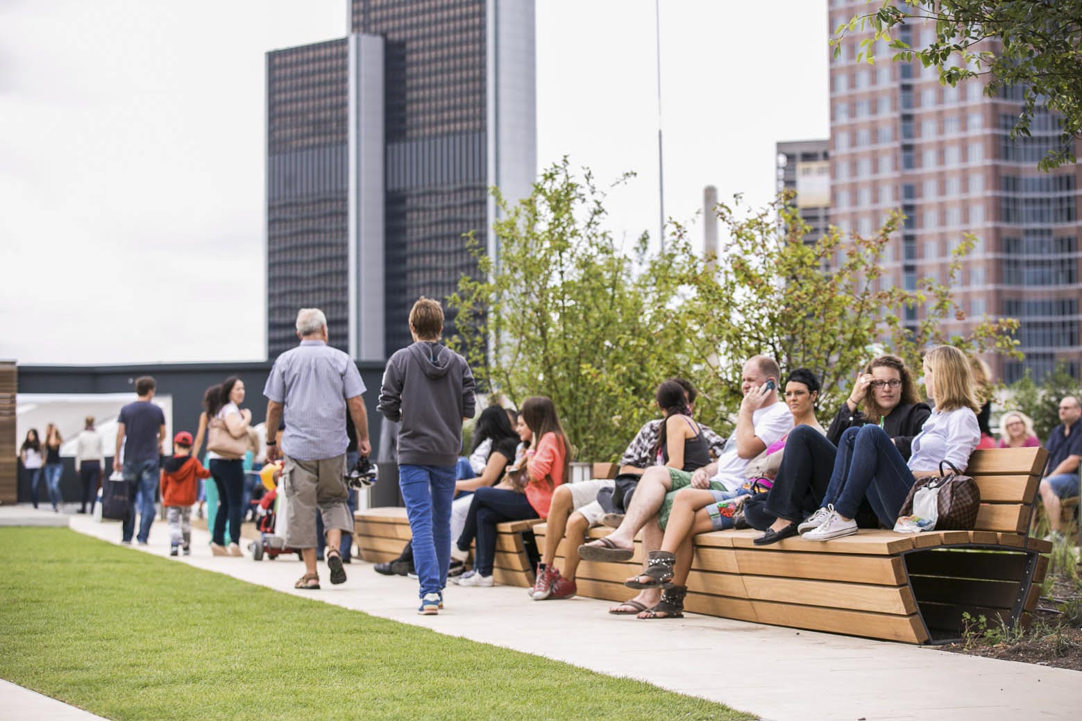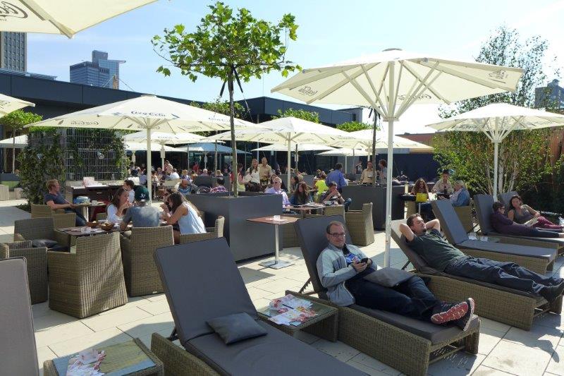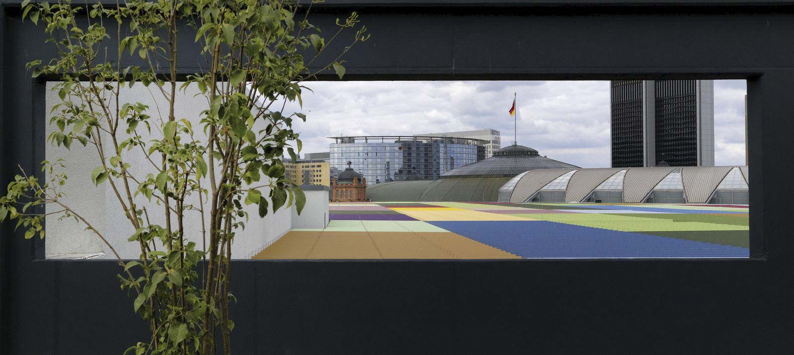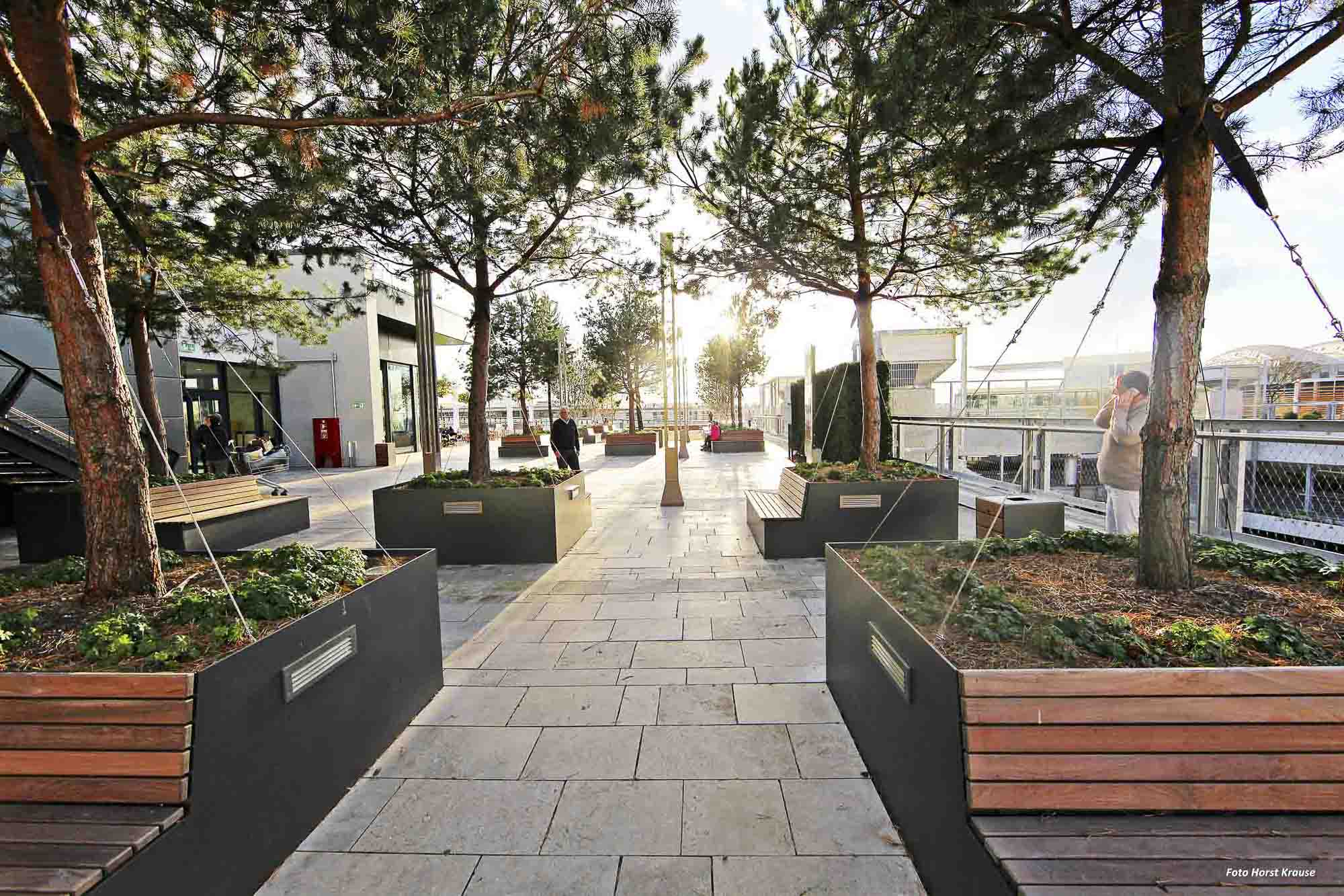 Skyline Plaza is a 409,000 square foot retail center in the heart of Frankfurt’s new convention center district. Skyline Plaza’s rooftop brings a variety of activities to Frankfurt’s newest shopping destination. Mahan Rykiel was hired to assist the Architects with the landscape architecture for the entire roof garden by providing concepts through design development.The rooftop is more than one and half times the size of a football field and offers something for everyone from yoga to playgrounds for the kids, and even a vineyard. There are a wealth of possibilities to discover, including a large chess board, table tennis, foosball, petanque (boules) field, putting green and a performance stage for events. Two restaurants offer unparalleled views of downtown Frankfurt and Europa Boulevard. The concept incorporates a strong axial vocabulary, contrasting the curving, undulating lines of the architecture. A meandering path weaves large spaces for active play with intimate gardens. A broad promenade links the elevator lobby with the restaurant terraces and the play spaces.