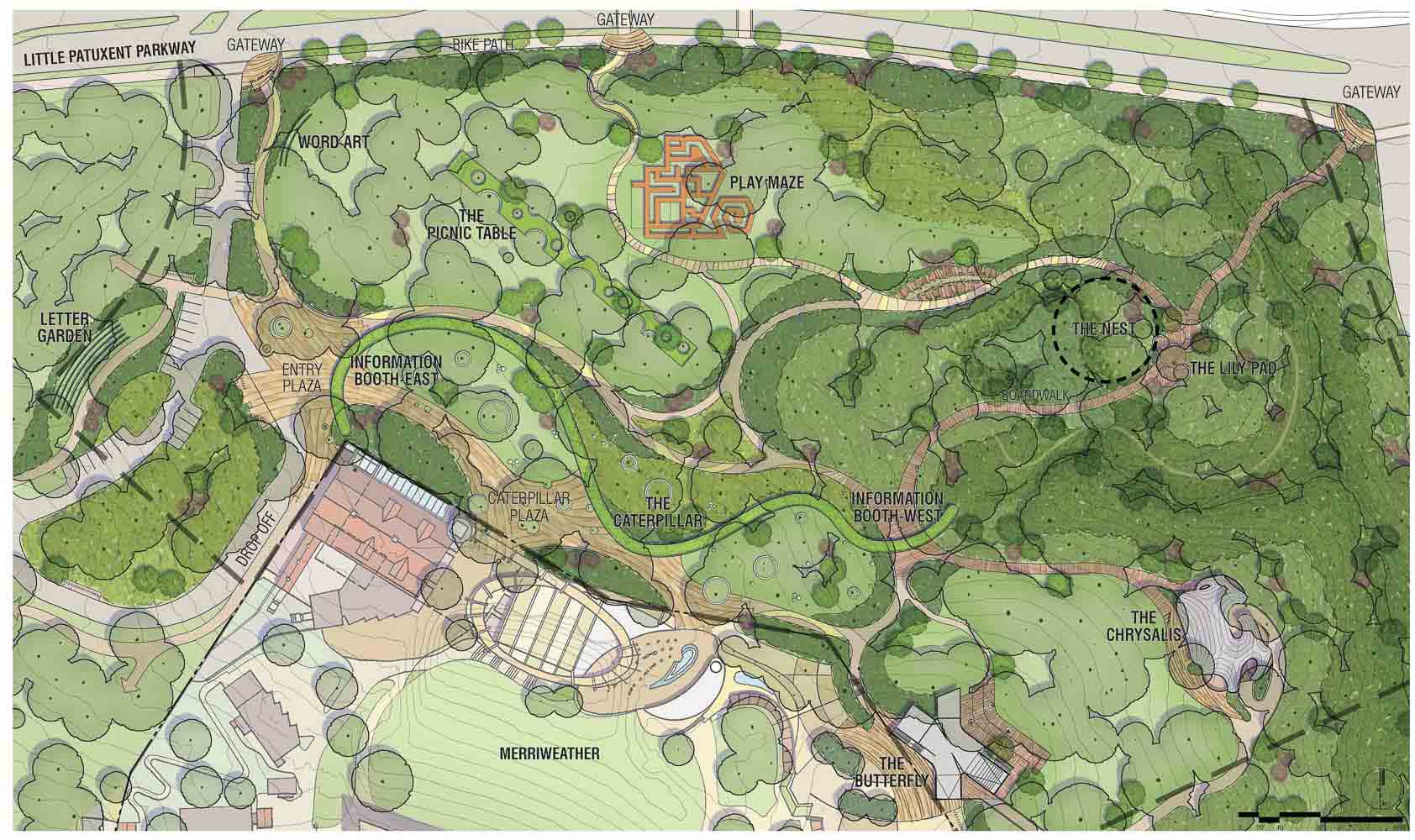 Mahan Rykiel is responsible for the overall landscape design including the entries and for linking the various areas of the park through a system of pathways and boardwalks. MRA is also designing custom site furnishings for the park. Other areas include the “Lilypad”, “Picnic Table”, “Playground” and “The Butterfly” designed to be enjoyed by all age groups. The park will be constructed in phases as funding becomes available.