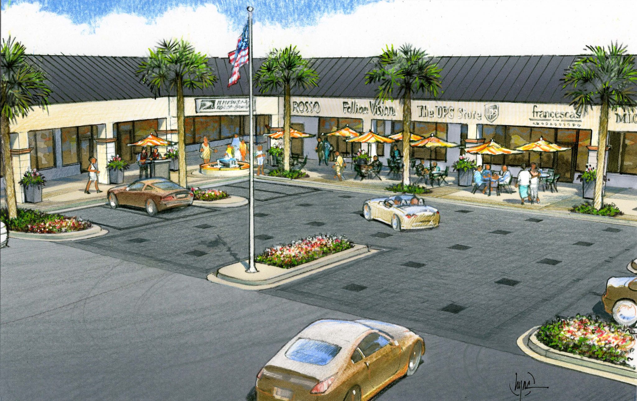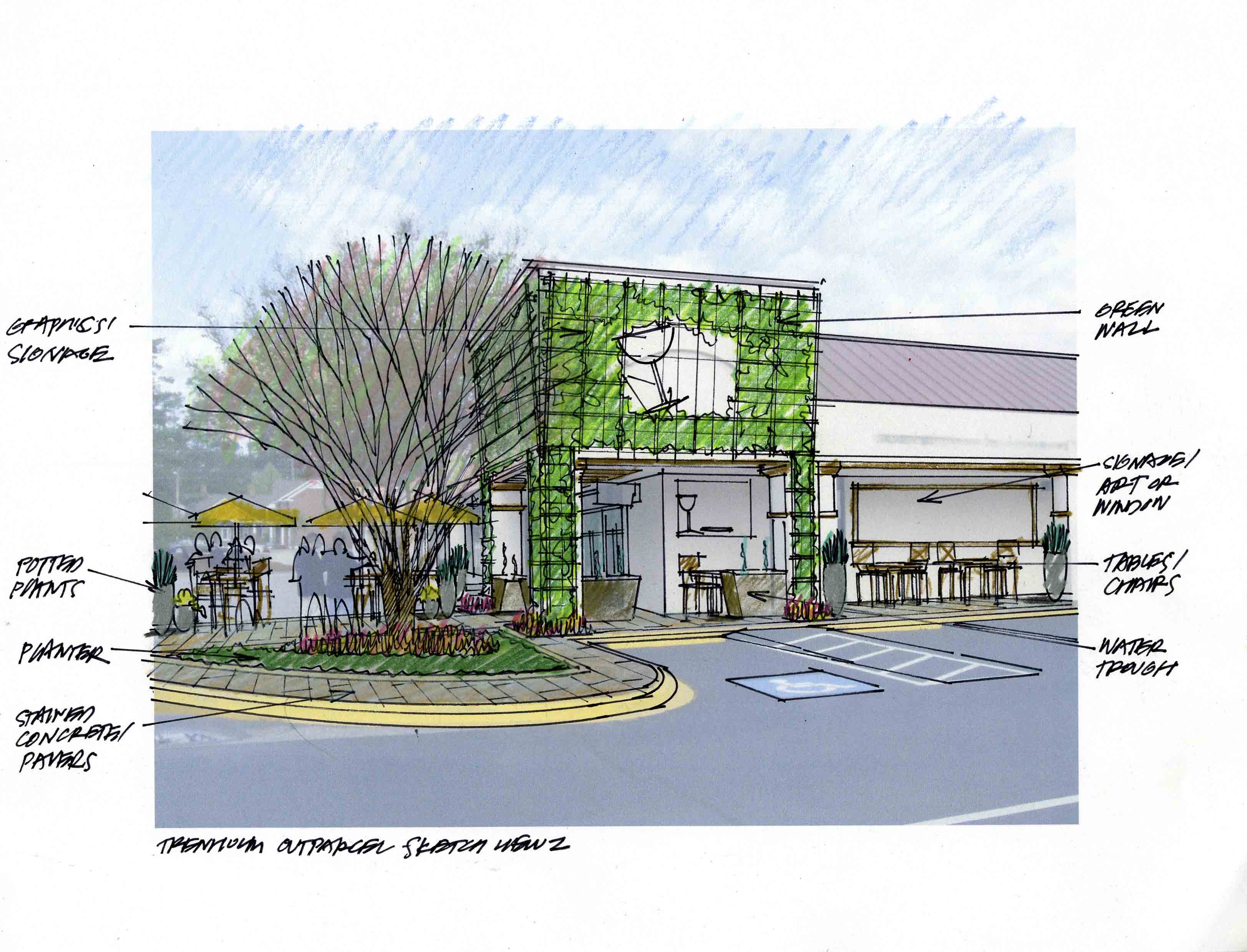 Site amenities provide a competitive advantage for retail developers. For Trenholm Plaza in Columbia, SC, Mahan Rykiel Associates evaluated the opportunities and provided a menu of enhancement options for the existing retail center. A new cafe plaza, landscaping and fountain convinced a sought-after F&B tenant to relocate. Adjacent special paving in the parking area doubles as an event area.