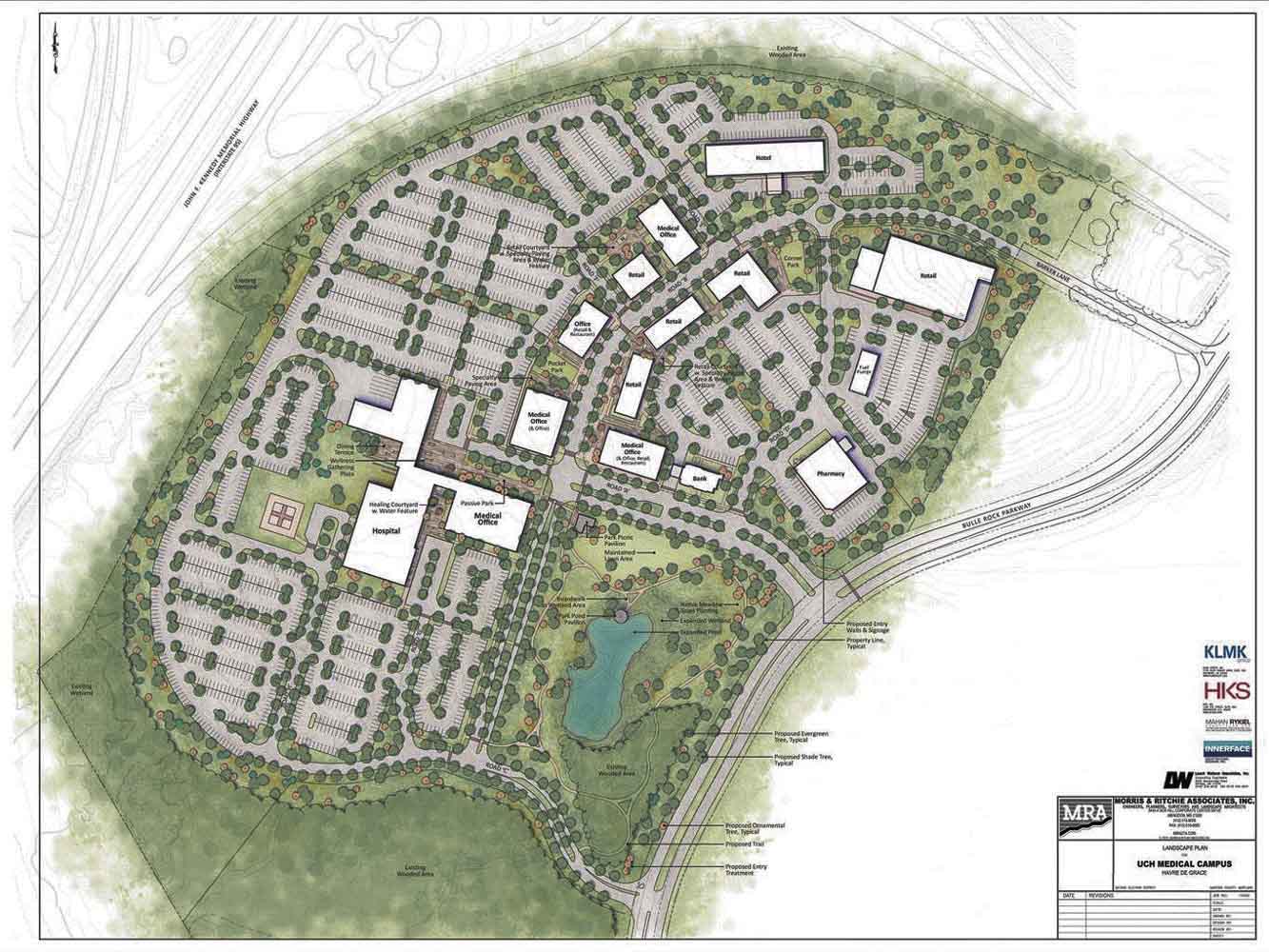 Mahan Rykiel Associates (MRA) worked with the design team, Upper Chesapeake Health, and The University of Maryland Medical System to provide site planning and landscape architecture for the 30% schematic design (Certificate of Need) of this mixed use site. Phase I will include parking, a trail system, amenity spaces, a park, and the “gateway” to the project.