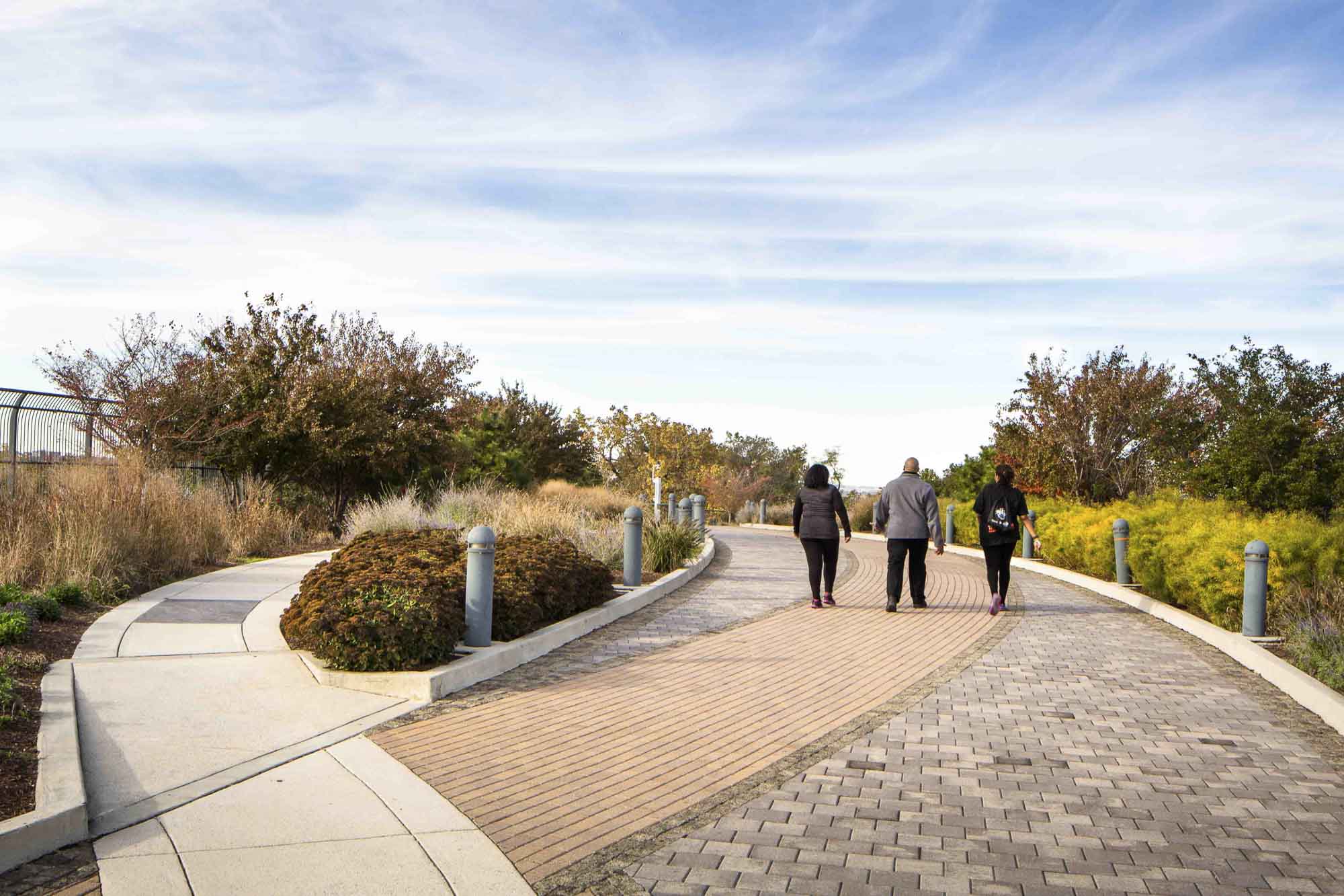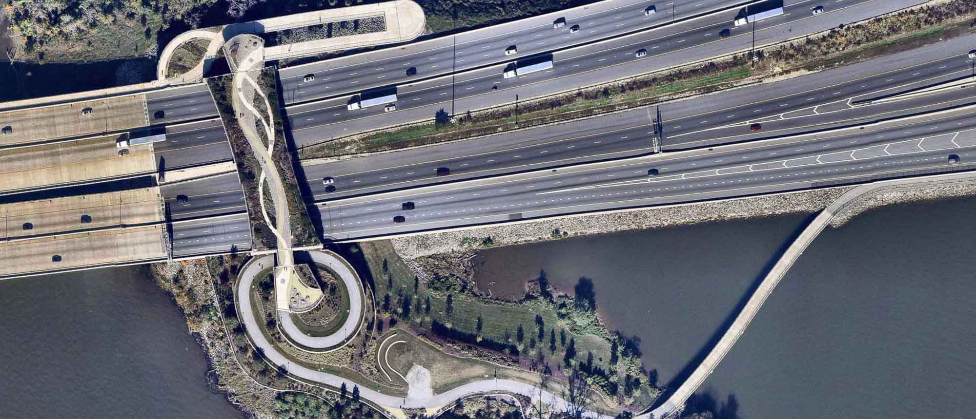 Mahan Rykiel’s design for Rosalie Island features a traditional, Olmsted-inspired park layout with broad expanses of lawn surrounded by large shade and flowering trees. Conceived as a bridge over the bridge, the Deckover flanks the island and provides a direct pedestrian and bicycle connection to Alexandria. The View Garden Deckover commands dramatic views to Washington, DC and Potomac River landmarks. Winding, accessible paths provide a dramatic sequence of spaces leading up to an open park that includes a meadow, wetland interpretation area, and observation pier. Mahan Rykiel was responsible for refining the Design Development plans, developing Construction Documents and planting plans for all areas. Coordination with the four jurisdictions and more than 60 agencies involved with the bridge has been a significant part of the project.